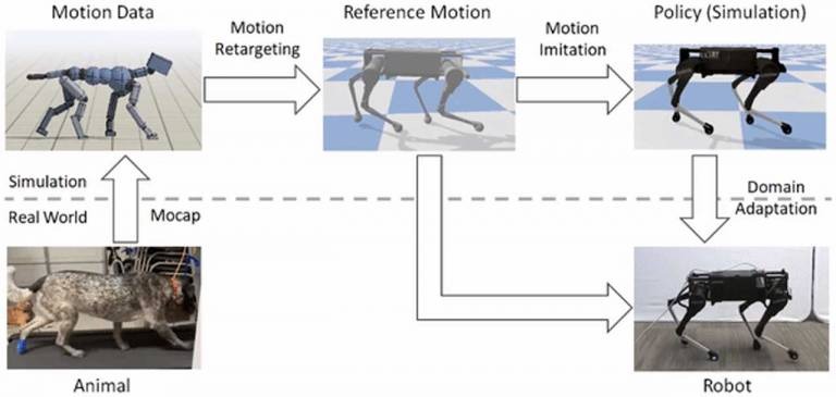 Scientists say that the framework has three main components, including motion retargeting, motion imitation, and domain adaptation. The first step using a given reference motion is to create motion retargeting stage map that retargets the motion from the original animal's morphology to the robot morphology. The next step is the motion imitation stage and uses the retargeted reference motion to train a policy for imitating the motion in a simulated environment. The last step is the domain adaptation stage that transfers the policy from simulation to the real robot via a sample efficient domain adaptation process.