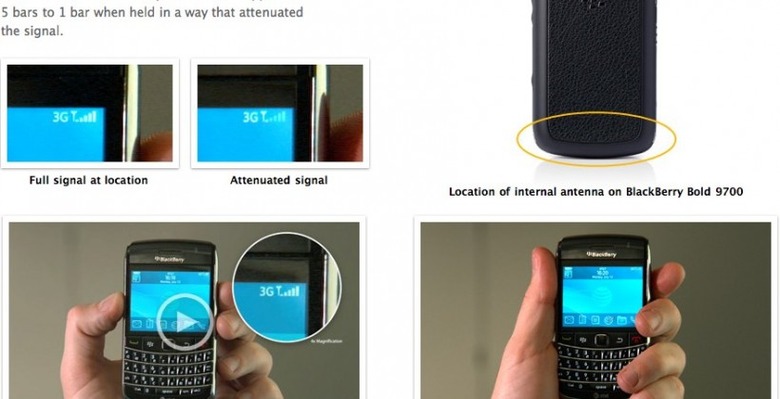 Apple currently has an antenna-specific page on their site that discusses attenuation and demonstrates how gripping the BlackBerry Bold 9700 in a certain way can negatively affect signal strength. CEO Steve Jobs himself mentioned the same results on stage yesterday, as an example of how the iPhone 4's antenna issue was "an industry problem" rather than uniquely an Apple problem.
