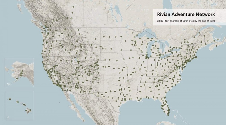 By the end of 2023, Rivian says, there should be more than 3,500 DC fast chargers spread across over 600 sites. Each location will have multiple chargers, and they'll all be powered by 100-percent renewable energy. That will prioritize wind and solar, the automaker promises.