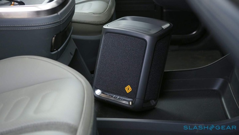 When you're driving a huge battery on wheels, you might as well use that for more than just transportation. That's the approach the Camp Speaker takes, a cube-shaped Bluetooth speaker which docks into the space under the front center armrest. There, the R1T's battery keeps it topped up and ready to go.