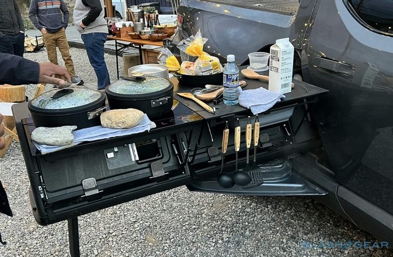 Since the R1T doesn't have a driveshaft running the length of the vehicle, it can free up that nook between the cab and the bed for a healthy 11.6 cu-ft of extra storage. Normally it's empty, but cough up the $5,000 for the Camp Kitchen and you can fill it with a pull-out food prep area. Two electric cooktops – powered by the R1T's own batteries – along with a collapsable sink, water tank, and drawers for a matching Snow Peak kitchen set.