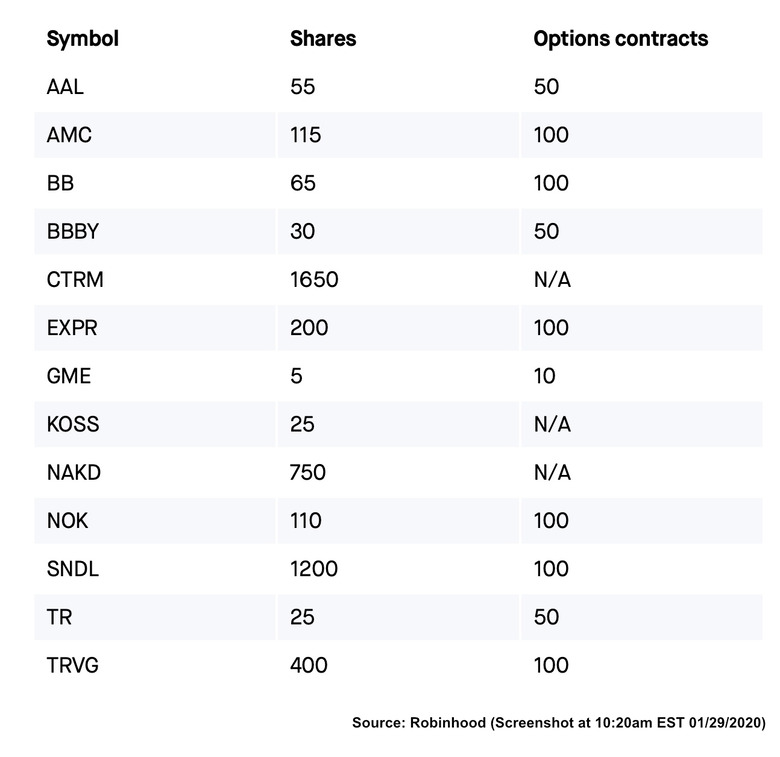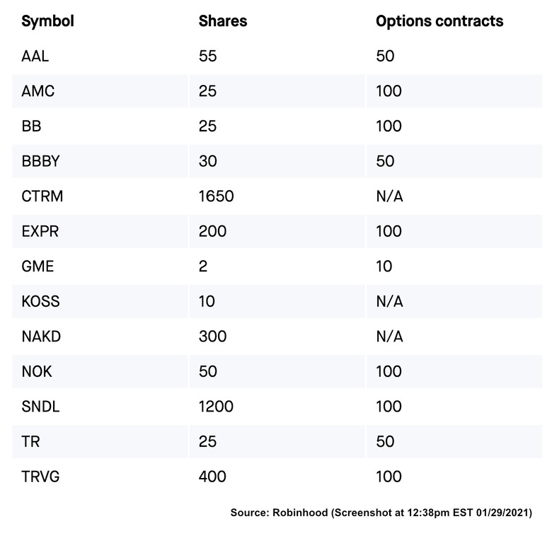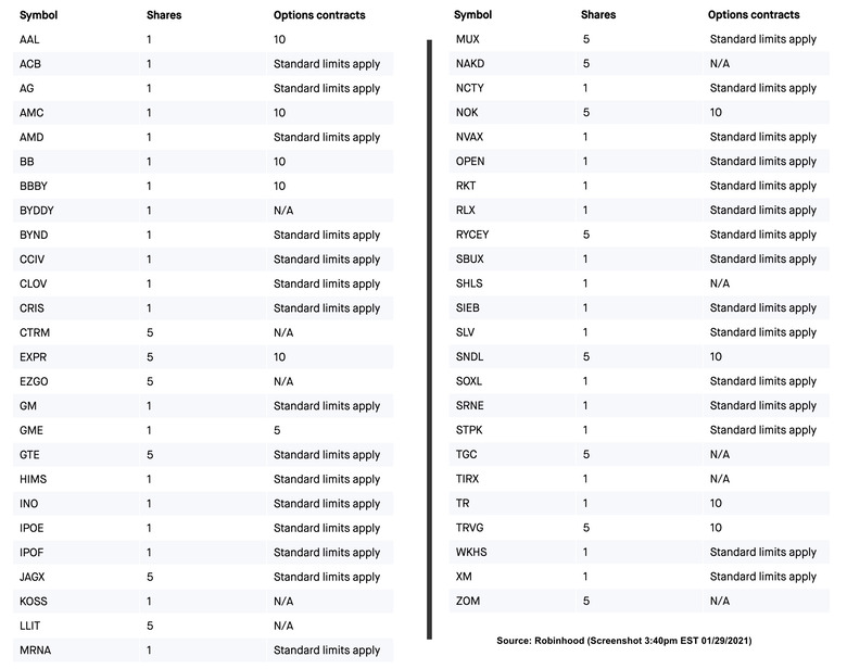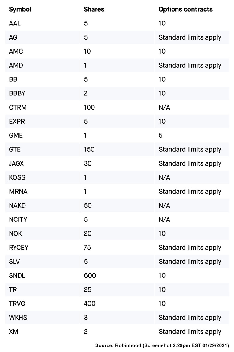 Update: Robinhood has changed its limits, most notably reducing the amount of GameStop shares individuals can hold. That's been dropped to 2 shares, as per the updated table below.