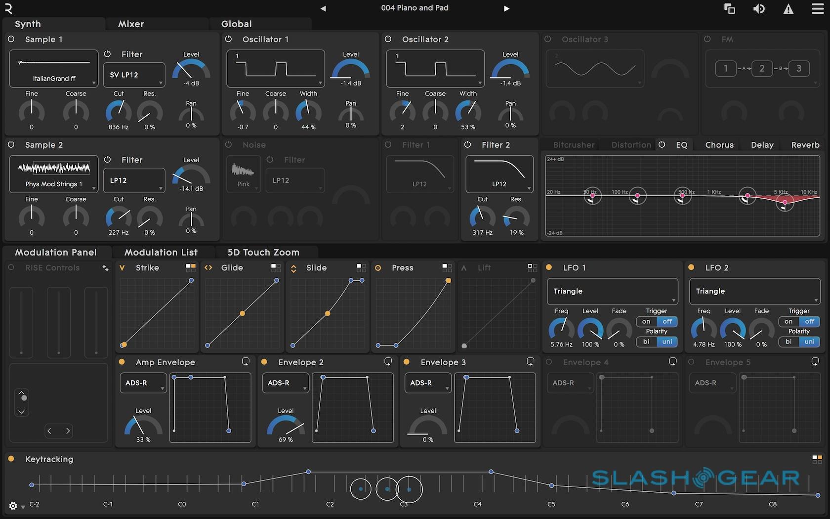 Slide is effectively the same thing, only flipped 90-degrees: the movement up and down each keywave. Finally, Lift is the speed with which you pull your finger off the keywave: a sudden lift might pluck a string, while a more languid one could let the note fade out more gently.