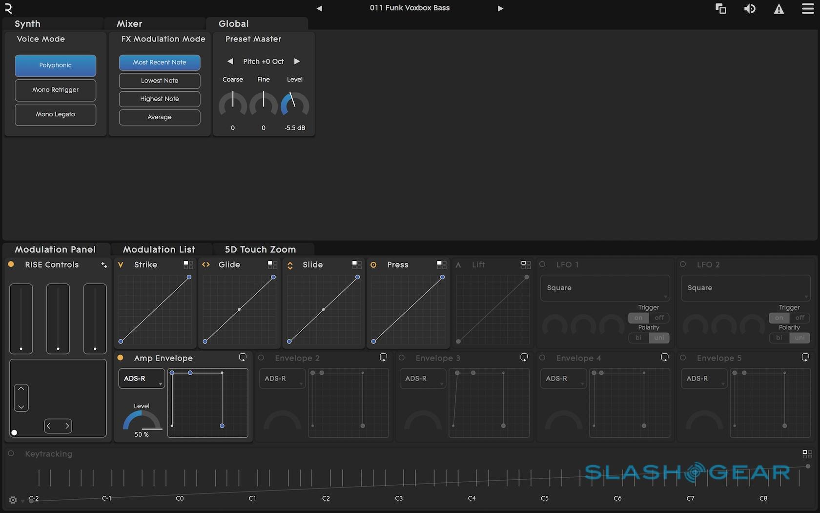 RISE breaks each press down into five components, dubbed Strike, Press, Glide, Slide, and Lift. Strike is the most traditional, the force with which your finger hits the key, then Press is a measure of the pressure applied following that initial strike. By combining a light Strike and then varying your Press force afterwards, for instance, you can create a soft voice chorus that swells over time.