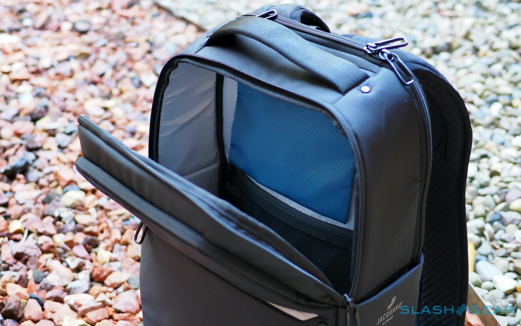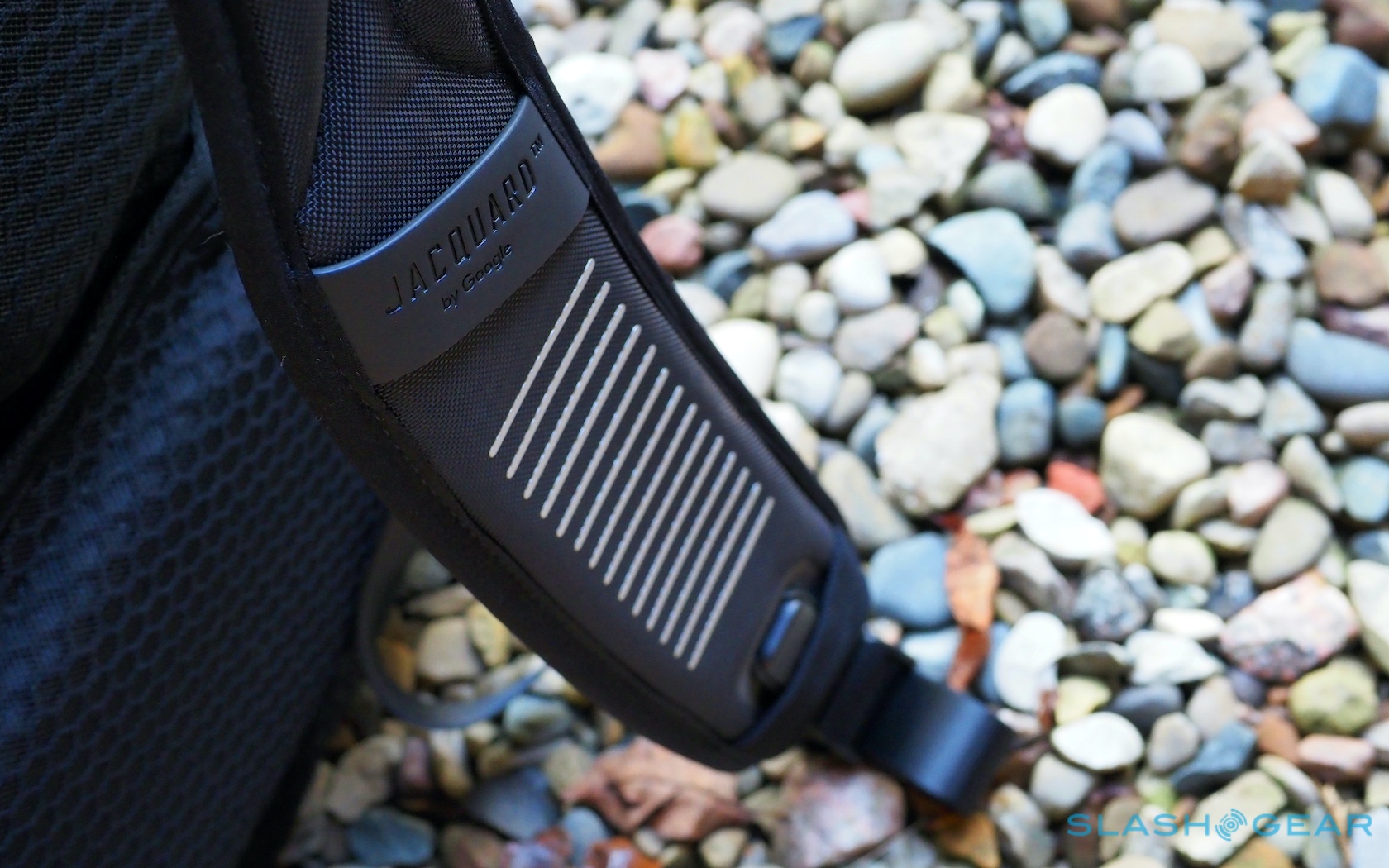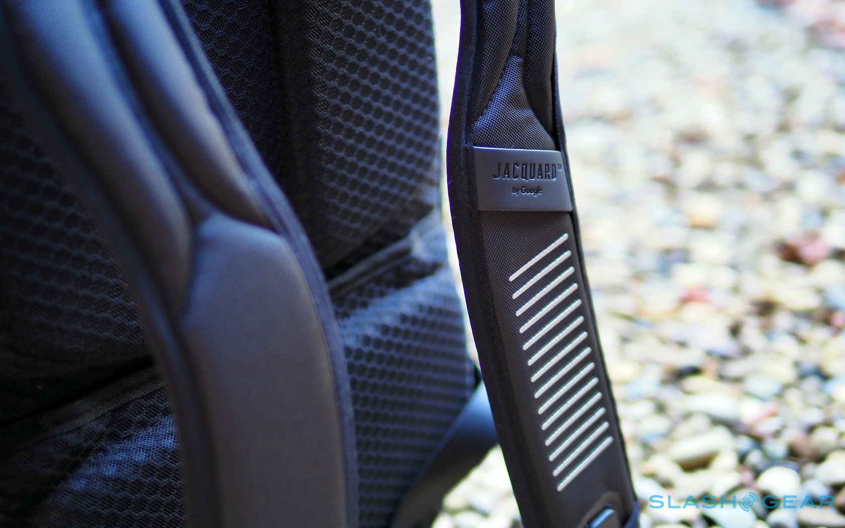 What sets the Konnect-i Backpack apart from the rest of Samsonite's bags, of course, is Jacquard. The left strap has Google's touch sensors woven into it, above a nook where the Jacquard tag clips into place. It's a fairly tight fit, and half-covered with an elastic strap, so I'm pretty confident the Bluetooth dongle won't get shaken out inadvertently even if you're stuffing the bag under a seat or throwing it in the back of the car.