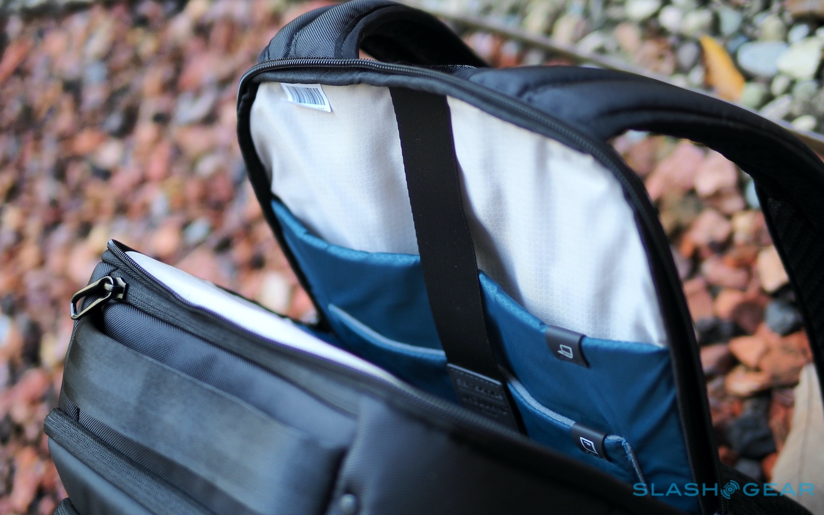 There'll be two versions of the backpack, one "slim" at $199.99 and the other "standard" sized at $219.99. Samsonite says both can hold a 15.6-inch laptop; a 16-inch MacBook Pro slotted in snuggly. There's also a tablet pouch, and then a separate compartment for things like your camera, lenses, notepads, or anything else. It's all lined in a lighter silver and contrasting blue fabric, making it easier to see what you've stowed away.