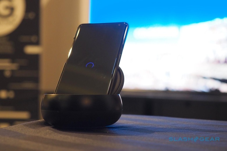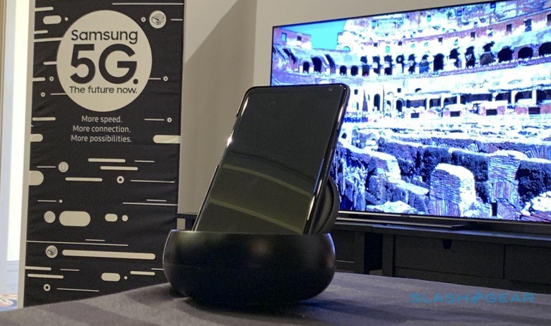 Samsung and Qualcomm's setup is straightforward. There's a temporary 5G base-station hoisted up near the ceiling, while across the room is a prototype Samsung smartphone in a DeX Station dock.