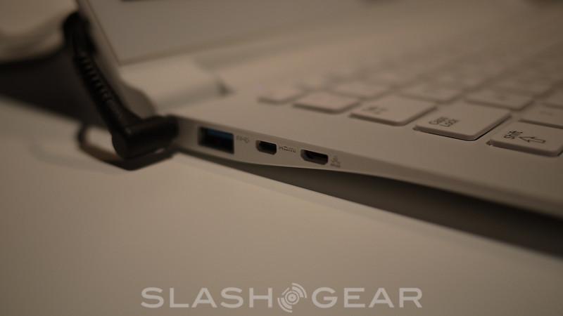 What's also impressive is that the hinge in the Ultrabook has two points where it can locks into place. You'll be able to open up the lid to the usual angle, for which you'll be greeted with a stopping point in the hinge. Then, you can take it even farther down to a 180-degree flat position where it will also be snug in place.