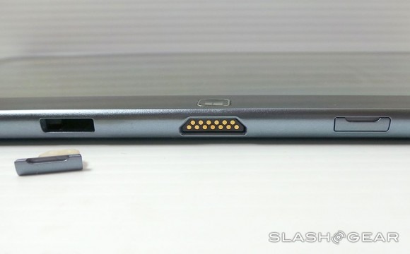 There's a power button that also locks the display, a button that switches off/on the rotation lock of the display, and there's a set of three units you're going to want to be aware of if you plan on moving forward with the full notebook experience. The first is the center power port and surrounding it are two docking slots. The docking slots are safely covered up with plastic covers you'll never find yourself messing with unless you do indeed want to work with the dock, while the center power port stays open.
