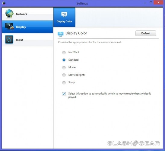 With Easy Settings you're able to access your Network, Display, and Input in one easy-to-use location. It's almost as if Samsung saw how Microsoft was handling user access to each of these vital areas and decided that they'd take it upon themselves to simply usher it all in on their own much more friendly plate. Network simply allows you to connect to wi-fi and your AT&T network via SIM card if you like, Display allows you to flip through a series of pre-set standard color tweaks for your screen, and Input turns your touchscreen off or on – simple stuff!