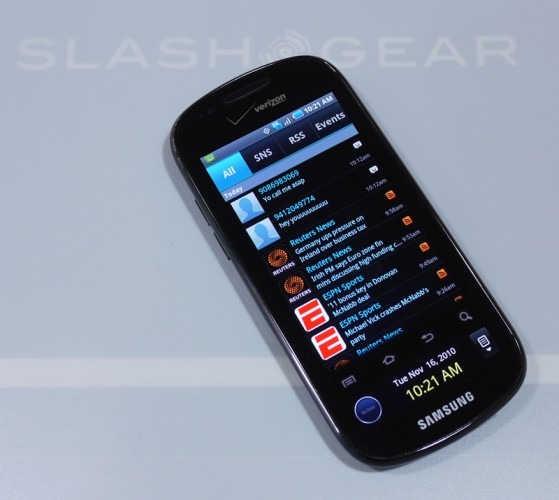 Altogether it's a smaller device than previous Galaxy S handsets – Verizon expect it to be more popular with female users than earlier models – and fits nicely into the hand. The case still feels relatively plasticky, though, which makes for a lightweight phone but not one which feels as rugged as, say, HTC's recent models. Samsung's 1GHz Hummingbird processor makes another showing, and it keeps Android 2.1 running slickly. We're disappointed to not see Froyo on the Continuum, and Samsung hasn't said when we can expect a software update or, indeed, whether it might arrive before Gingerbread is on the scene.