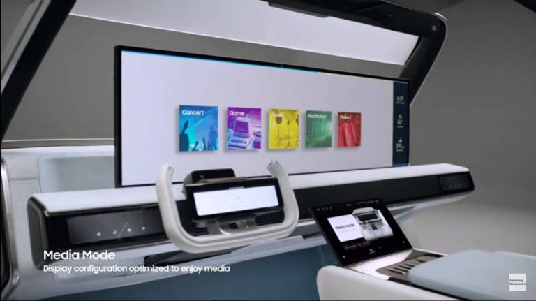 We've seen motorized screens before, but Samsung's version is the most immersive with its 49-inch landscape, with the idea of converting your vehicle into a moving office or living room while losing none of the functionality and appurtenances of modern technology.