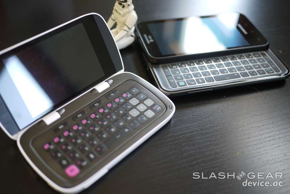 While this smartphone is far and away, not even in the same ballpark, basically not even the same sport as the top tier smartphones also made by Samsung such as the Galaxy S II or even the top of middle-tier devices like the Samsung Captivate Glide (also pictured below), it does hold some sway in its own lower level of internet-capable handsets. This device looks rather unique with its mostly white and black chassis and pink accents, and the double touch displays are certainly a nice touch.