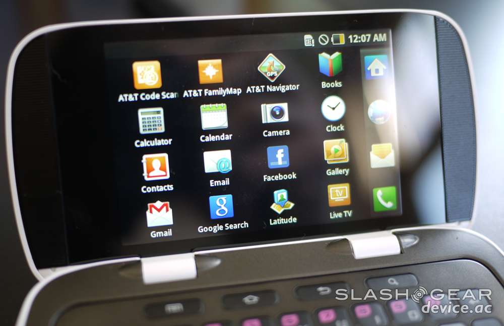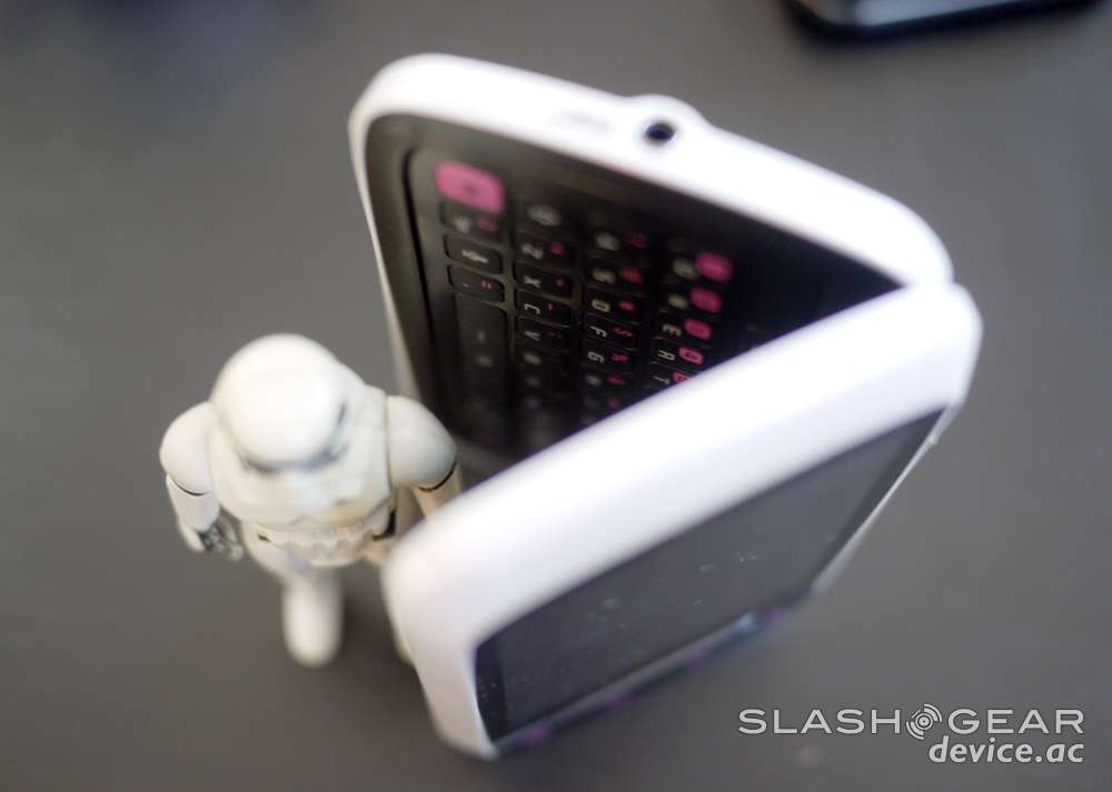 This little stormtrooper of the device has the oddest set of design cues, starting with the fact that it's got pink accents on the physical Android menu buttons. Very strange choice by Samsung if I do say so myself. There's a silvery plastic bar above the keys, Samsung and AT&T logos on the front, earpiece, and both proximity and light sensors. The device opens up like a clamshell the long way and sits at either a 135 or 180 degree angle when opened. Inside you'll find the second of two 320 x 480 pixel displays on one side, a full QWERTY keyboard on the other side with what you'll find is the reason for the pink accents on the outside: pink accents on the inside.
