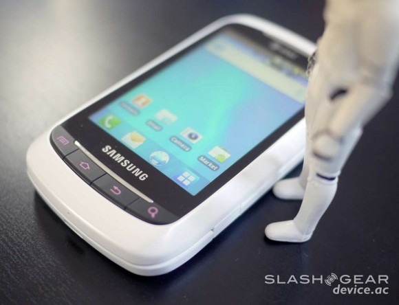 While this smartphone is far and away, not even in the same ballpark, basically not even the same sport as the top tier smartphones also made by Samsung such as the Galaxy S II or even the top of middle-tier devices like the Samsung Captivate Glide (also pictured below), it does hold some sway in its own lower level of internet-capable handsets. This device looks rather unique with its mostly white and black chassis and pink accents, and the double touch displays are certainly a nice touch.
