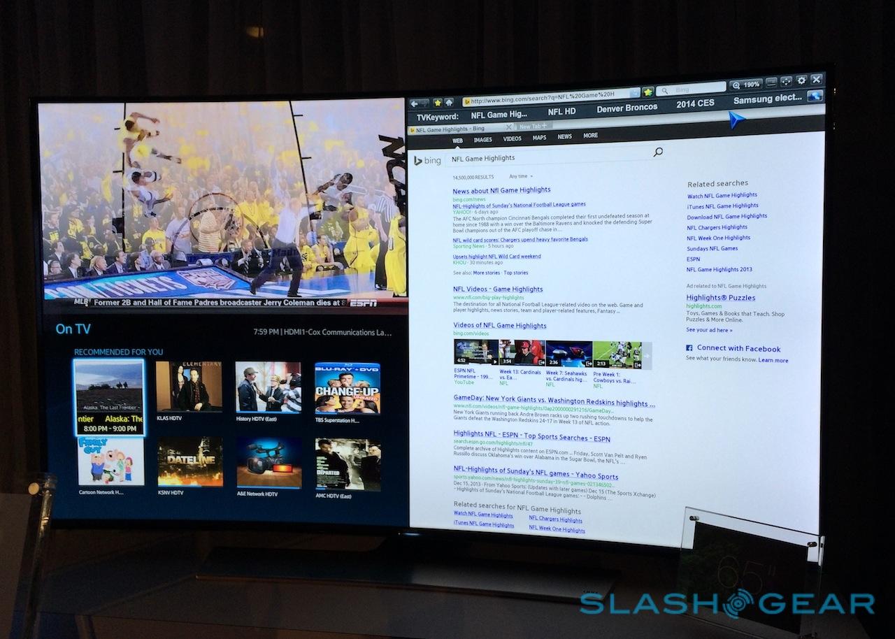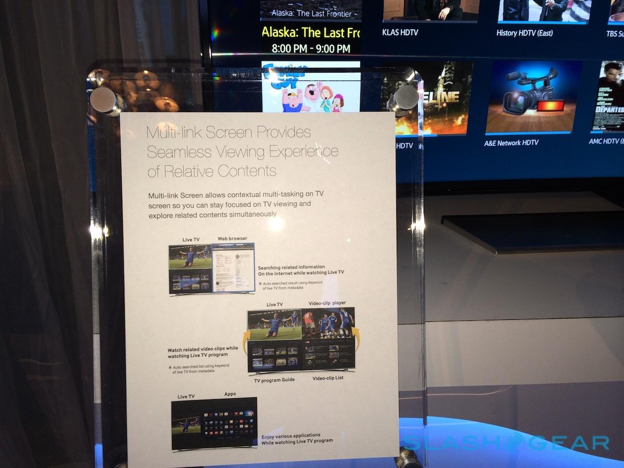 Samsung's approach has been a little more technical, throwing more functionality at its 2014 sets just as we'd expect from the company that led with things like voice control and integrated webcams. For this year, there's Multi-link Screen, which allows big TVs to be used to show different things simultaneously. Of course, we've had picture-in-picture for years, but Samsung's system puts things like the web browser, related video clips to what's showing on the other half of the display, and applications on-screen. Up to four can be shown at once, just like the Multi Window system on the new Galaxy NotePRO.