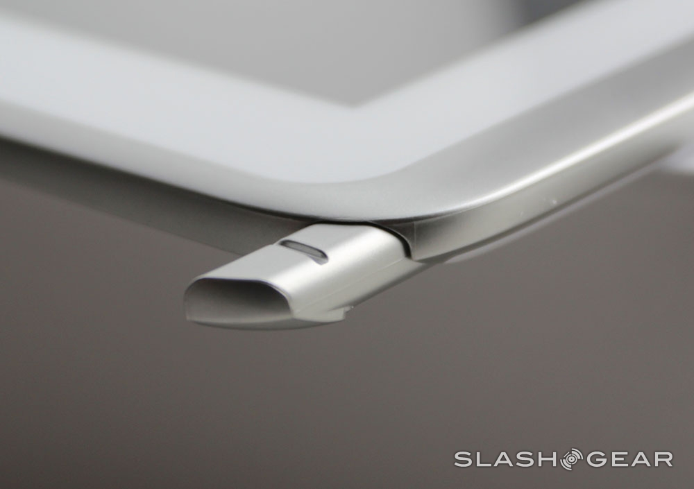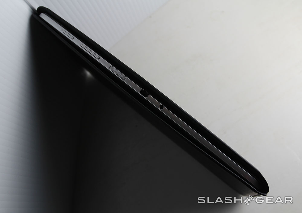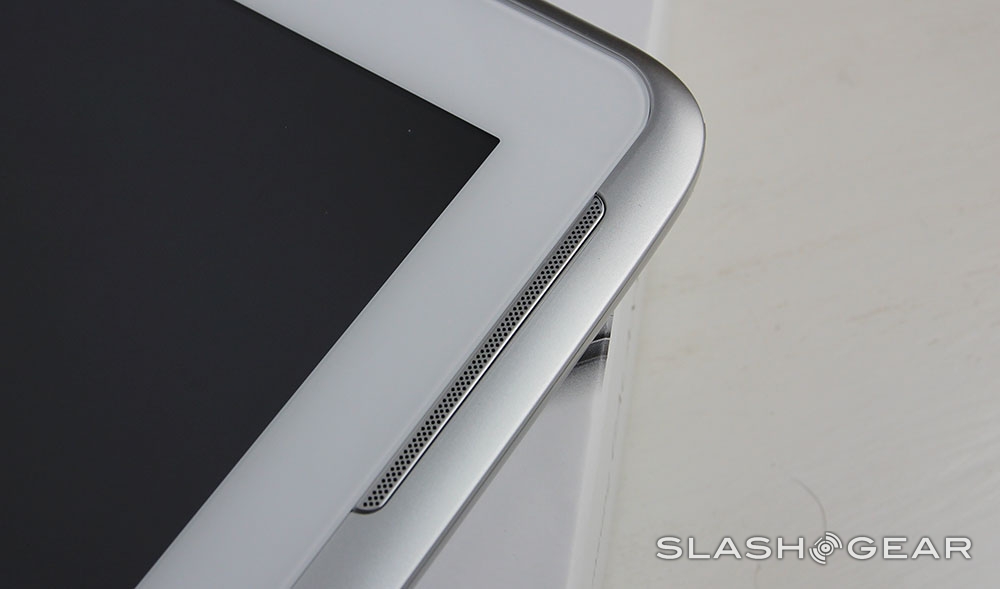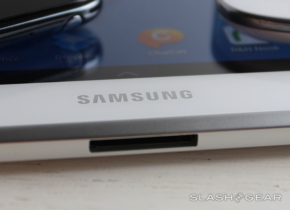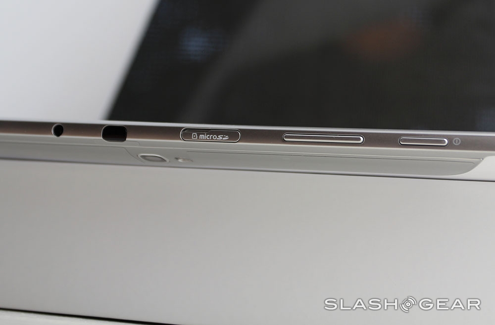 Up top you've got a power/sleep/lock button, a volume up/down button, and a microSD card slot. You've also got an IR-Blaster just like the Galaxy Tab 2 has so you can use your Peel app to change the channel on your television – and get a guide for channel browsing if your cable provider is able to be found by Samsung.