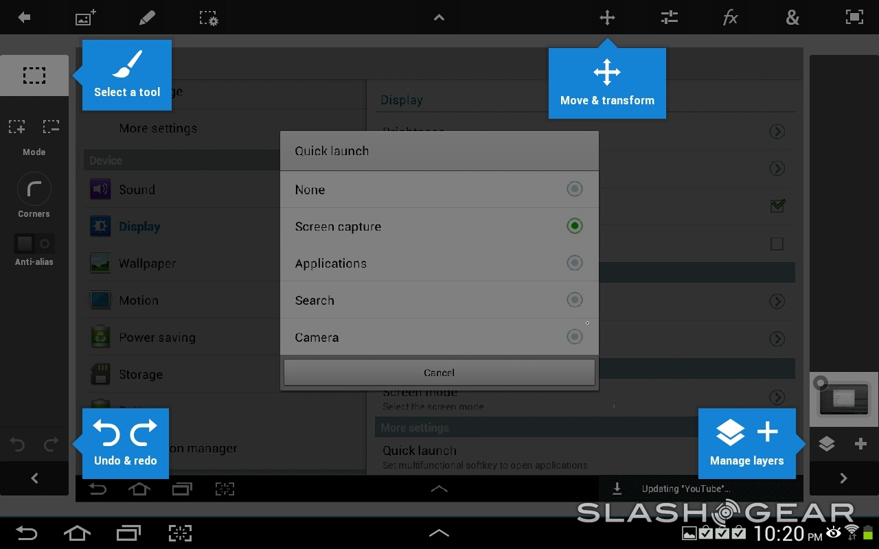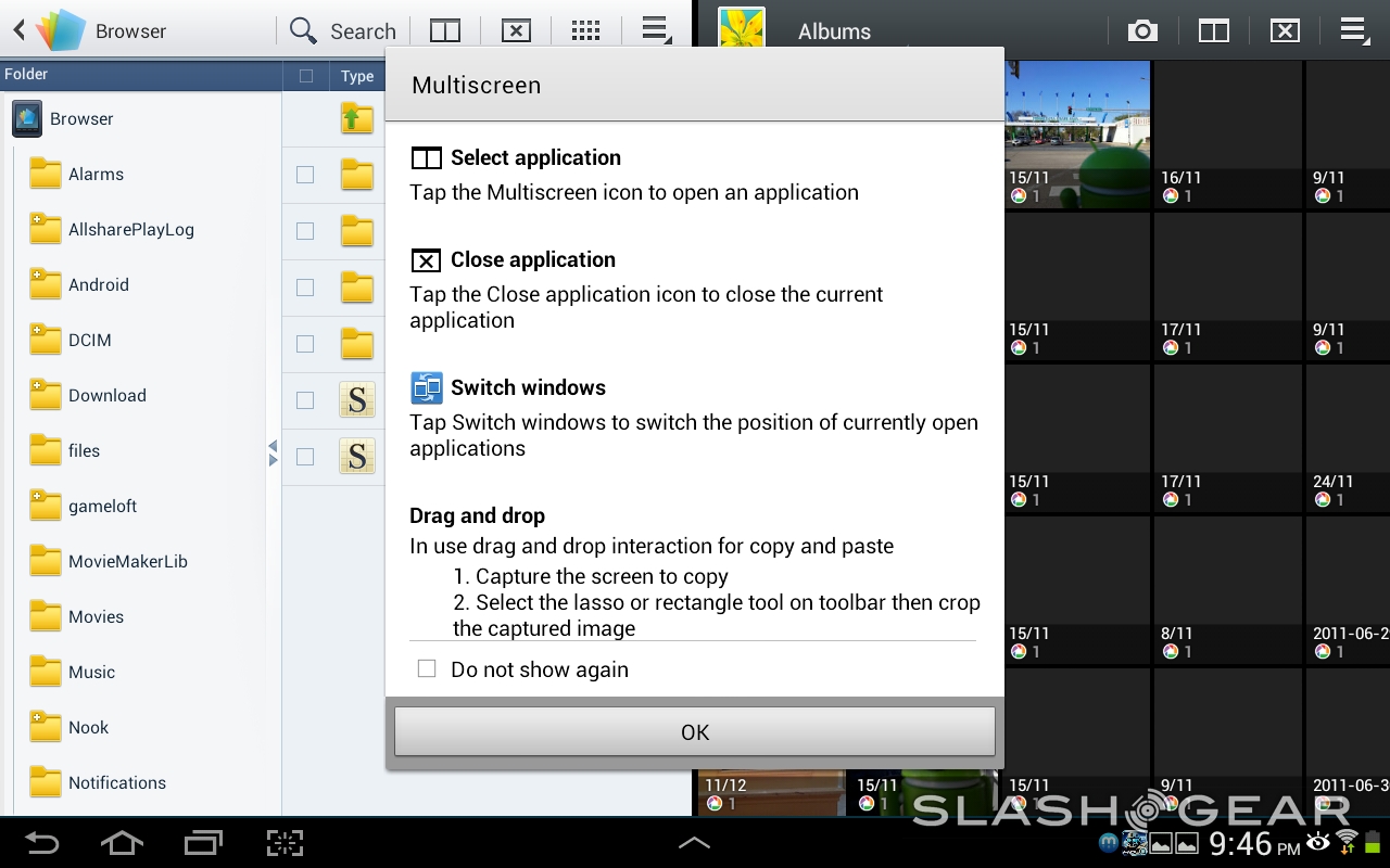 Then there's a new Muliscreen function – also appearing in the hands-on video above – that works in the following apps: your built-in Internet browser, Polaris Office, Video Player, Email, Gallery, and S-Note. When you've got one of these apps open, all you've got to do is tap the "Multiscreen" button up near the right-hand corner of the app at hand. From here you'll be greeted the first time with a set of abilities.