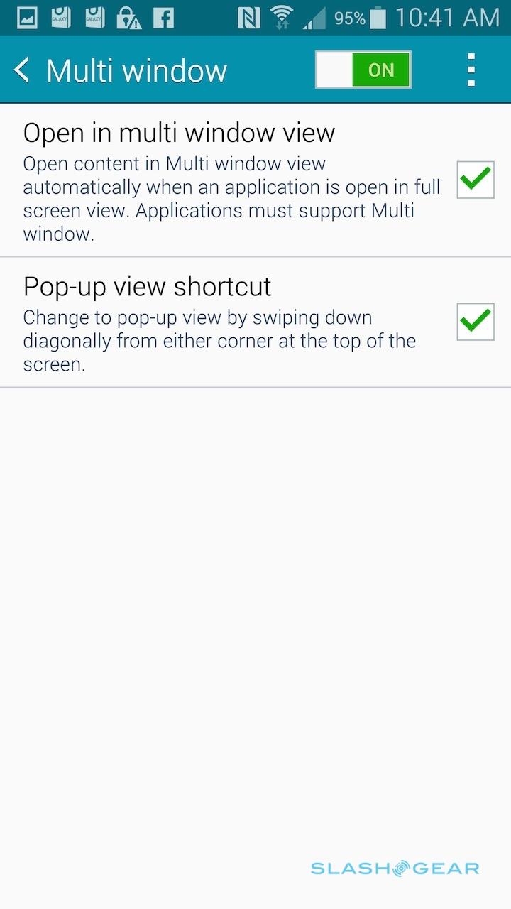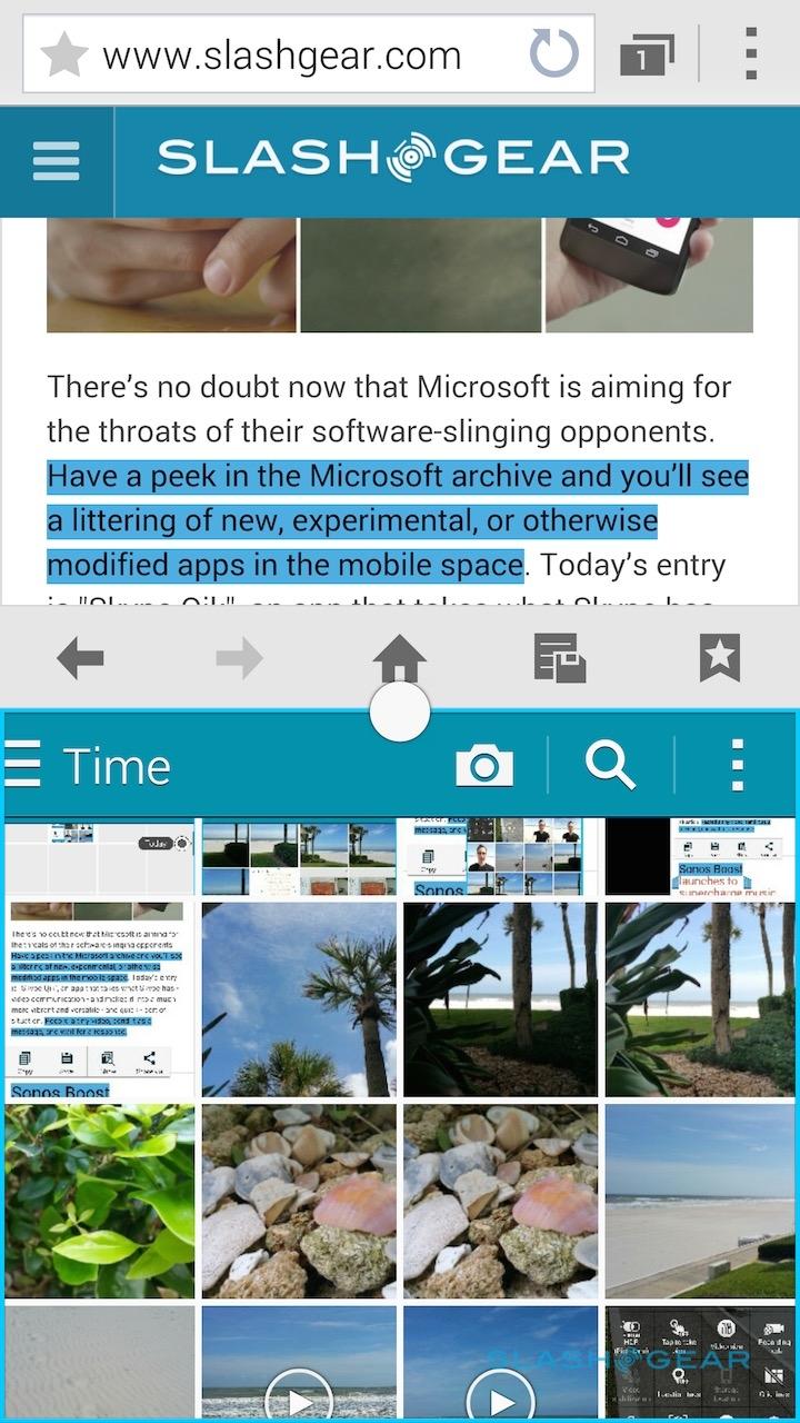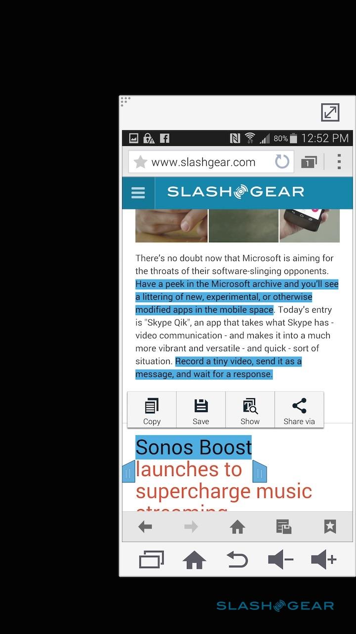 Samsung has had tools to make one-handed use of its bigger phones more straightforward for some time now, but they get a refresh on the Note 4. Swiping your thumb from the side of the screen to the middle and back again shrinks down the display, aligning it to whichever side you swiped from. You can then resize the window further, or maximize it again.