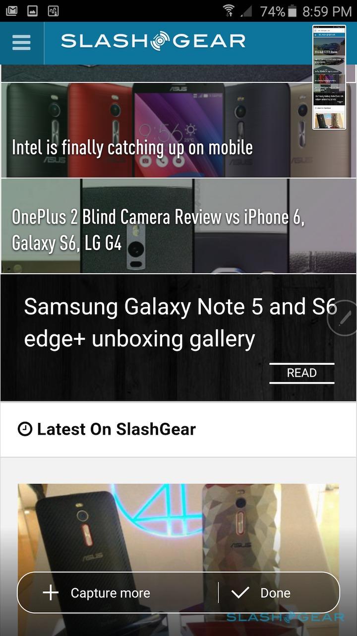 Tap "screen write" from the Air Command menu and after the screengrab is captured, there's a new "scroll capture" option at the bottom. That pans the screen down, adding to the screenshot as it goes; eventually, you're left with a single, long image, rather than a gallery full of individual pages.