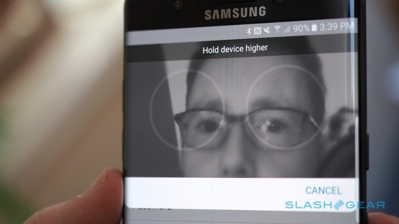 Underneath the display is a physical home button that doubles as a fingerprint scanner, as on the S7: it can be used with up to five different digits. However, above the screen is the Note 7's second biometric security system, an iris scanner.