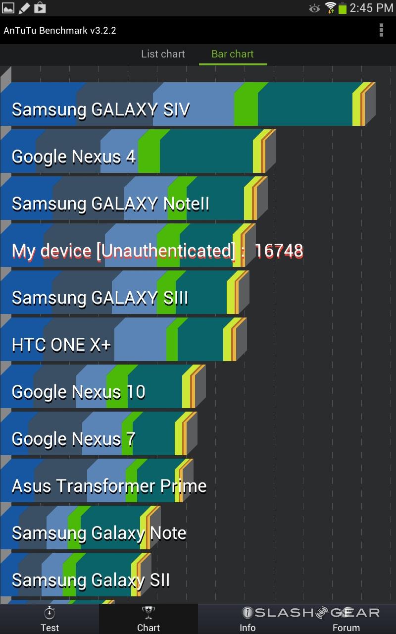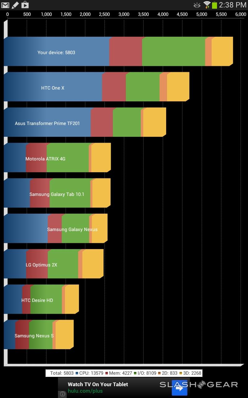 You'll find that this device busts out with its quad-core 1.6Ghz Exynos processor quite nicely – it's not going to top the newest smartphones on the market as it does have a bit more screen real-estate to work with, but it's certainly part of this current generation of multi-core beasts. Let us know in the comments below if there are any other tests you'd like us to run through other than the ones you see in the gallery above – we'd be glad to!