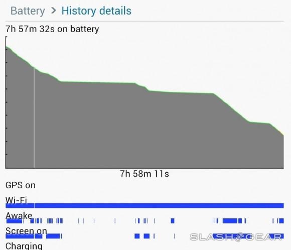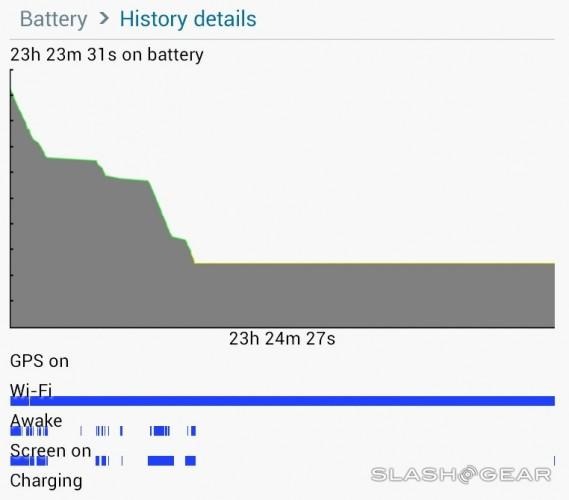 If you plan on using this device non-stop from battery topped-off to battery zero, you'll be working for a good 6 hours. Without mobile data running your battery into the ground, and if you're not kicking out top-brightness or using your GPS to map the world, you'll have some rather great battery life with the Galaxy Note 8.0. When the device's display is off and you're not downloading files – aka when the device is idle – you'll find your battery drain flatlining.