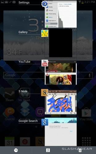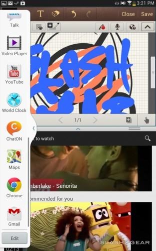 You can access a collection of Samsung Multi Window supported apps by holding down the device's back button – that little white tab you see can be pulled out and bam! There you'll see apps like Music Player, My Files, Polaris Office, S Note, and S Planner. Each of these apps can be run at half-screen, quarter-screen, or full-screen. This is separate from your basic Android app switcher (multi-tasking again, that is) which you can access with a long-press of your home button.