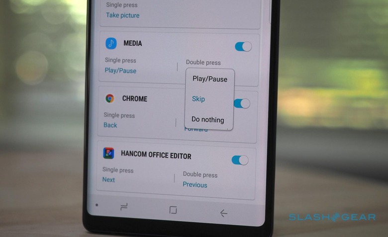In the camera, for instance, pressing once takes a photo, and pressing twice flips between the front and rear cameras. In the gallery, a single press moves forward one photo, while a double press moves back. The same thing happens in Chrome, moving forward or backward through webpages, and for presentation slides.