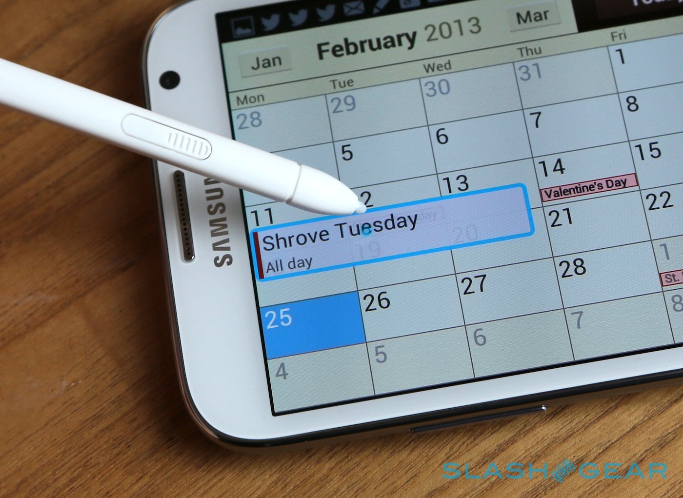 Samsung now supports hover with the pen, the display recognizing that the nib is floating a half-centimeter or so above the display. It gives the Note II a second degree of input: like positioning your computer cursor over an icon or control, but not actually clicking it. In Samsung's case, the actual functionality varies depending on the app, though it means you can see things like calendar event details without having to actually tap into the appointment, preview the content of a message from the inbox list, or look inside a gallery album. You can also use hover to scroll through lists, holding the nib near the end to automatically slide through the options.