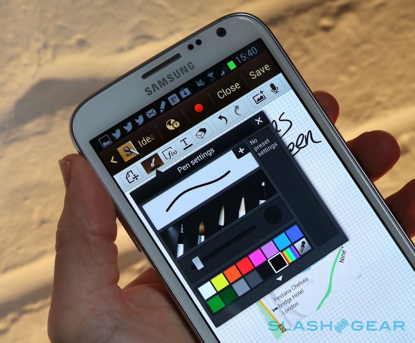 New is Quick Command, summoned by holding down the barrel button and swiping up the display; it works no matter what app you're currently in, and brings up a floating dialog for pen-triggered shortcuts. Write a question mark, for instance, followed by "weather" and you'll get a browser search for the current weather; write "@" and a name, and a new email will open up with suggestions as to the recipient from your contacts (if you've only one contact with that name, they'll automatically be selected). Somewhat annoyingly, given the excellent Gmail app is one of the boons of Android, Quick Command's email composer only works with the customized regular email application. Samsung preconfigures a number of shortcuts, but you can also train it to recognize your own.