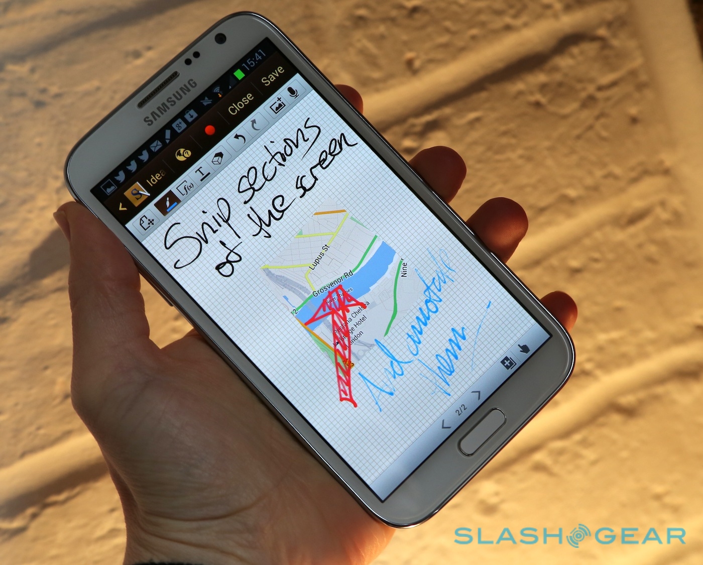 Samsung's stylus can also be used to grab sections of the display as screenshots. There's support for the hand-side-swipe to grab a full screenshot, just as on the Galaxy S III, but you can also hold down the barrel button of the pen and snip out a shape – as basic as a circle or square, or something more finicky – and then annotate it or add it to a notebook. S Note has various preset shapes and clipart, too, and you can add voice recordings, sections of maps, photos, video, and other attachments to each note.
