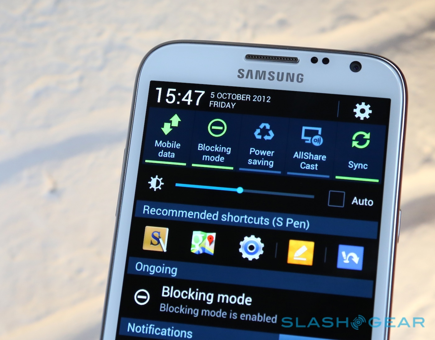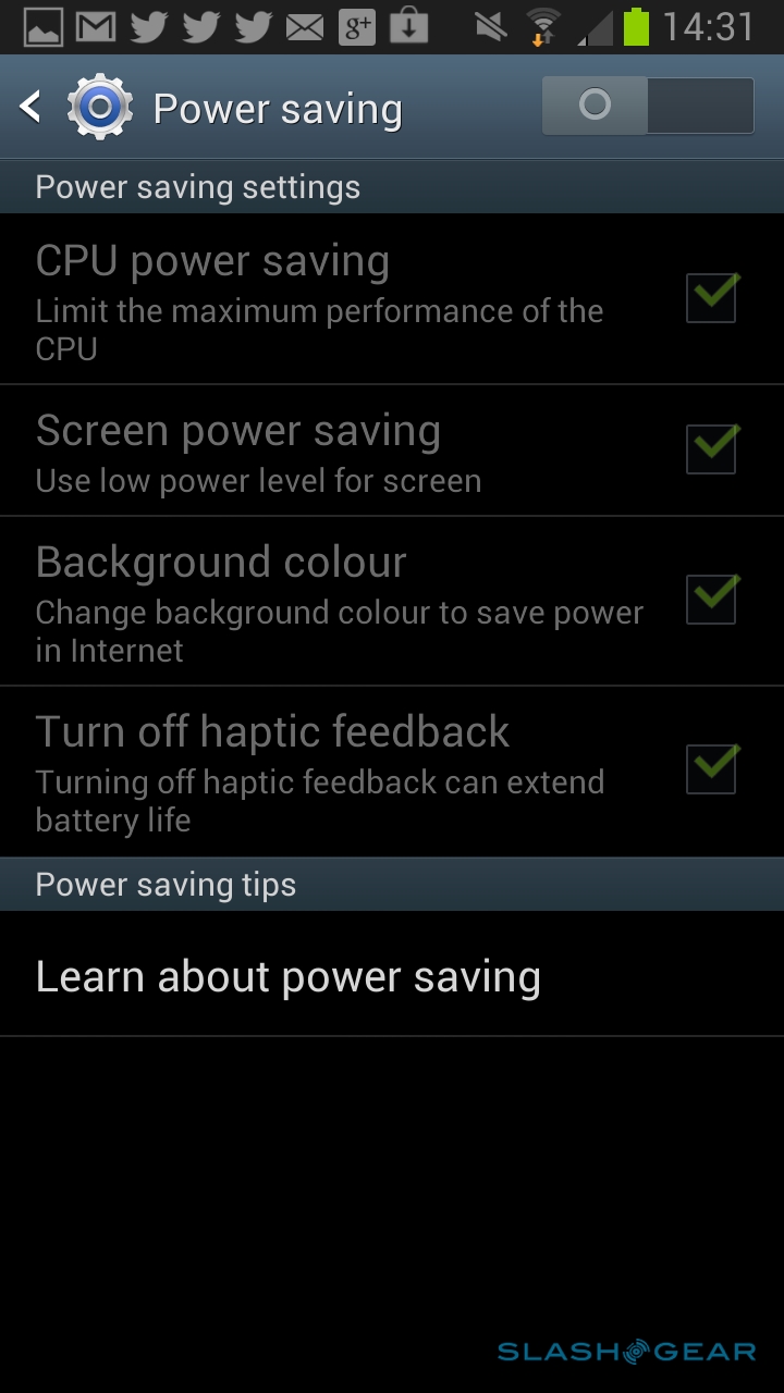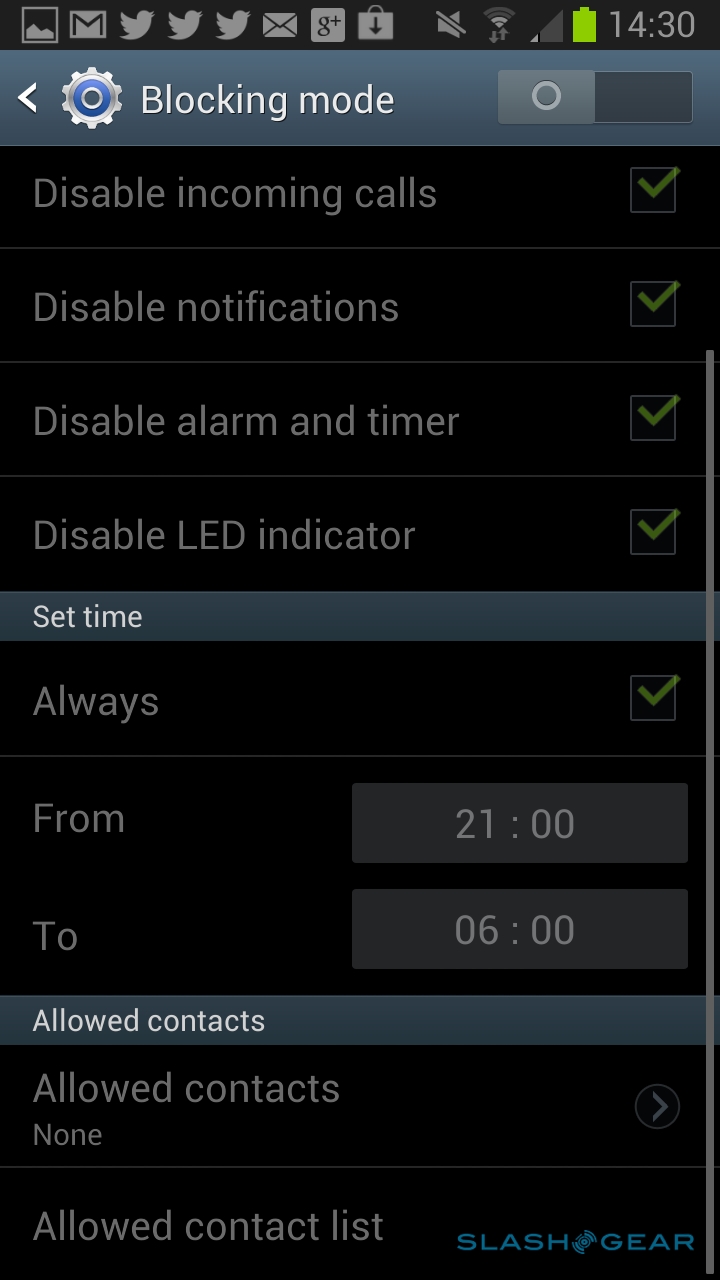 There are new power management tools on the Note II, too, with the existing Power Saving mode (which dims the screen and throttles back the processor, among other things) joined by a new Blocking Mode. That allows you to shut off incoming calls and notifications, alerts from the alarm or timer, and even whether the LED notification light blinks, either permanently or within certain hours. It's ideal if you leave your phone on your nightstand when you're sleeping and don't want to be perpetually disturbed by bleeps and flashing, particularly because you can also set a list of priority contacts who will be allowed through the lockdown.