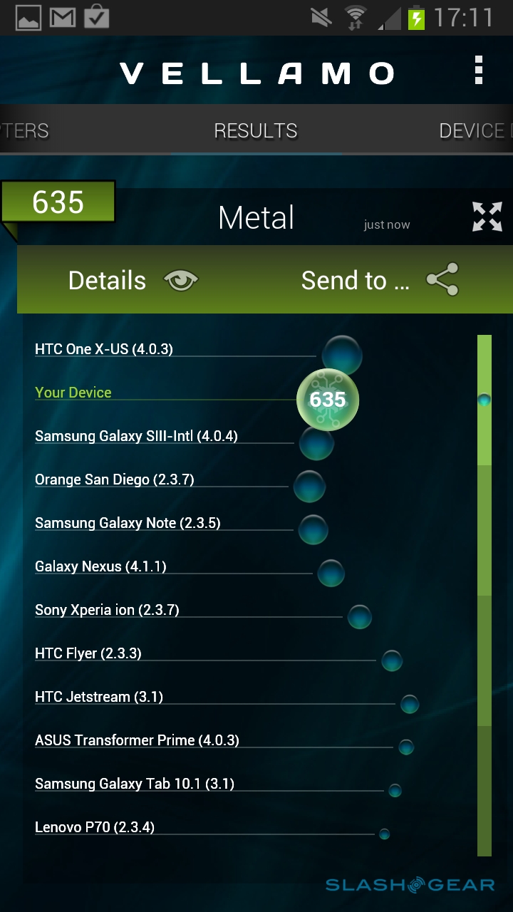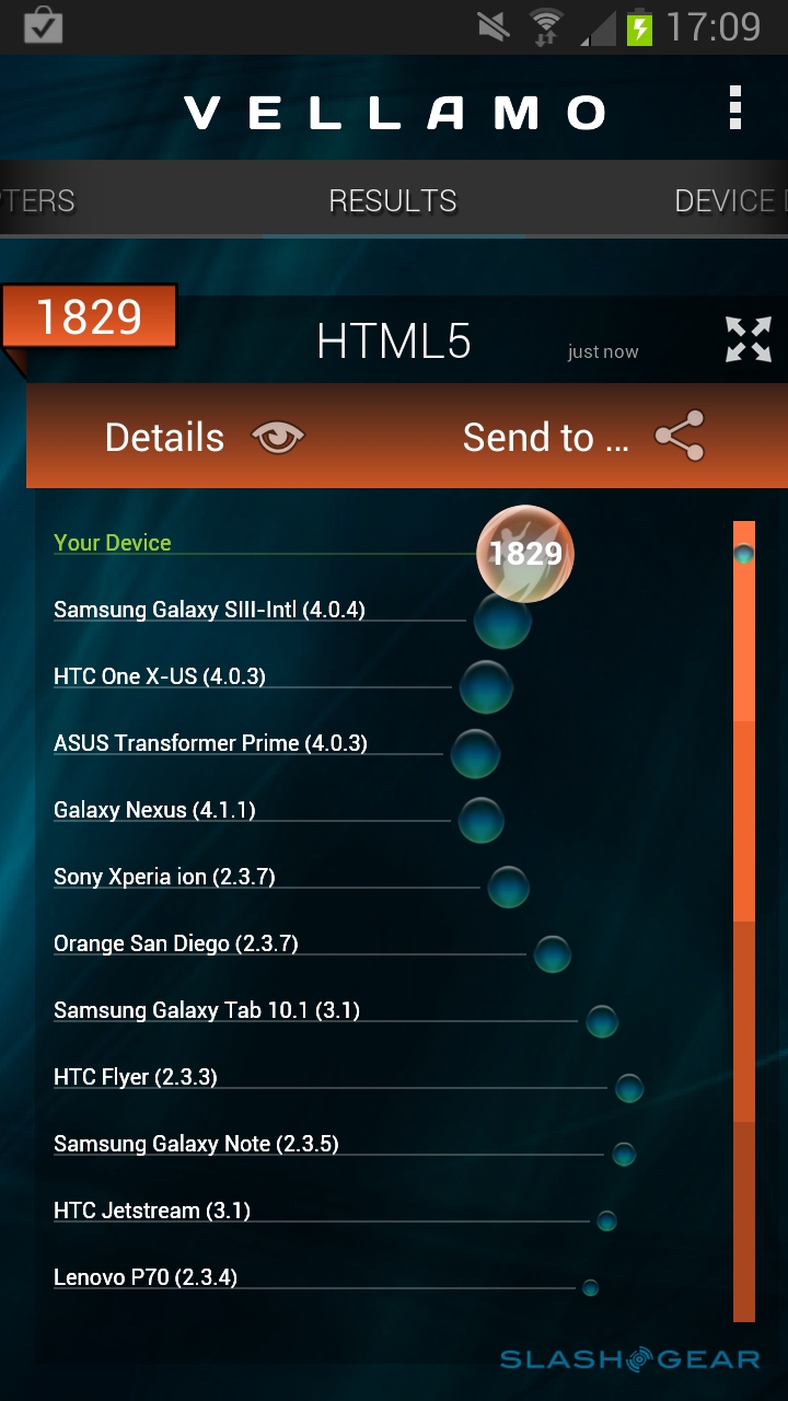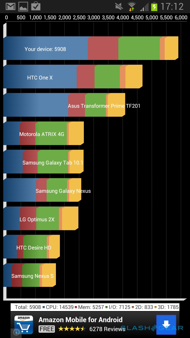 We had high hopes for the Note II's performance, and the reality didn't disappoint. Day-to-day it's smooth and lag-free, capable of handling any app we could throw at it. In terms of raw numbers, we saw a score of 5908 in Quadrant and 1829 in Vellamo 2's HTML5 tests and 635 in its Metal tests, while SunSpider came in at 1044.7ms. In short, this is one of the fastest, slickest Android devices around.