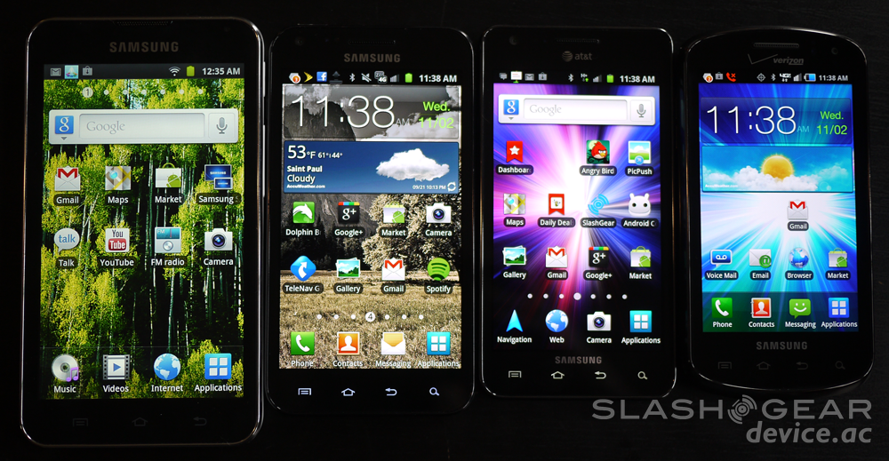 The Galaxy S II comes in several different shapes and sizes here in the United States, two of the more powerful ones being the two we've got right here, the Galaxy S II from AT&T and the Galaxy S II Epic 4G Touch. The first of two has a 4.32-inch display at 480 x 800 resolution and a 1.2GHz dual-core processor made by Samsung. The Epic 4G Touch has the same specifications on a 4.5-inch display. This means that the pixel density is down but the power is the same. The Galaxy Player 5.0 has a single-core processor at 1Ghz that's also made by Samsung and a display that's 5-inches large with the same 480 x 800 pixel resolution. In addition, the Galaxy Player has a TFT LCD display while the Galaxy S II units both have a Super AMOLED Plus display. Have a look here to see if you can spot the differences in quality: