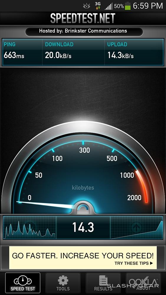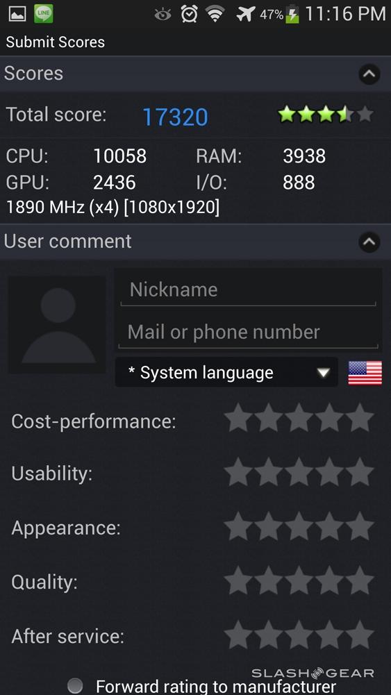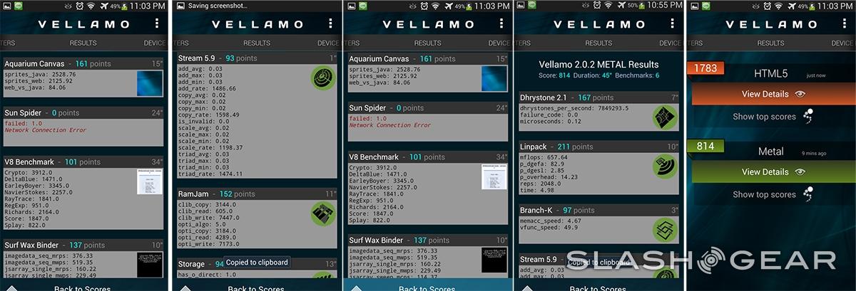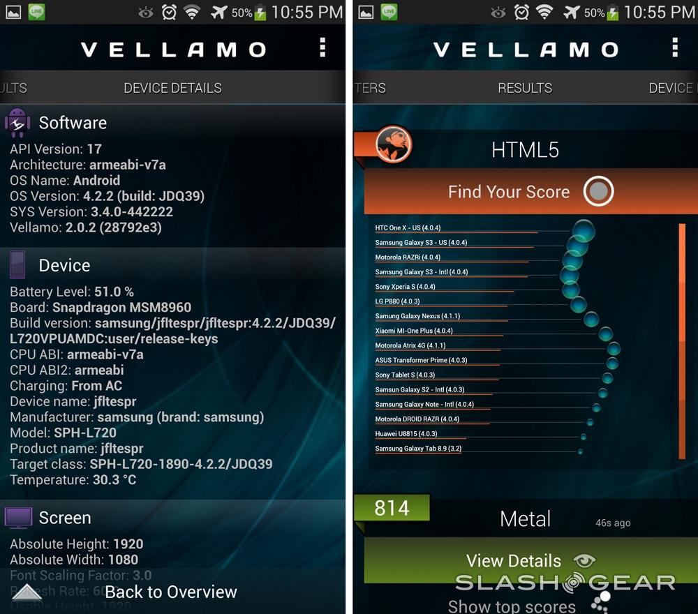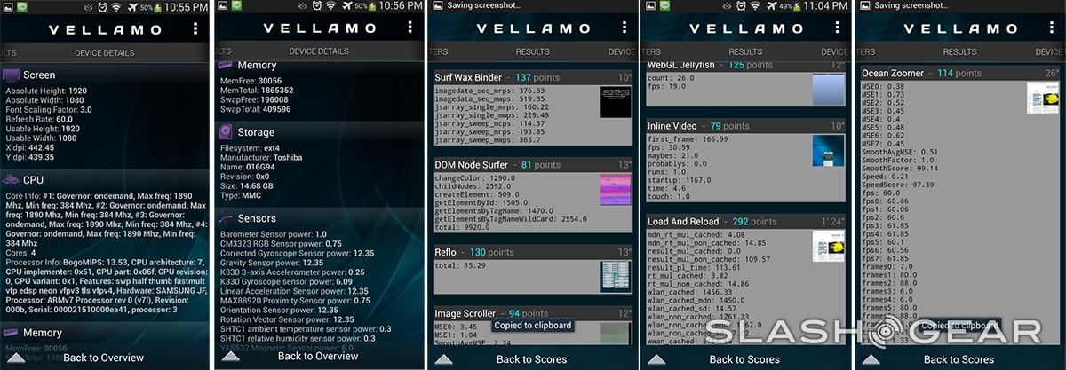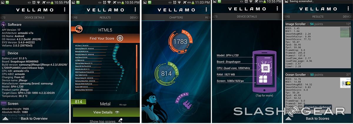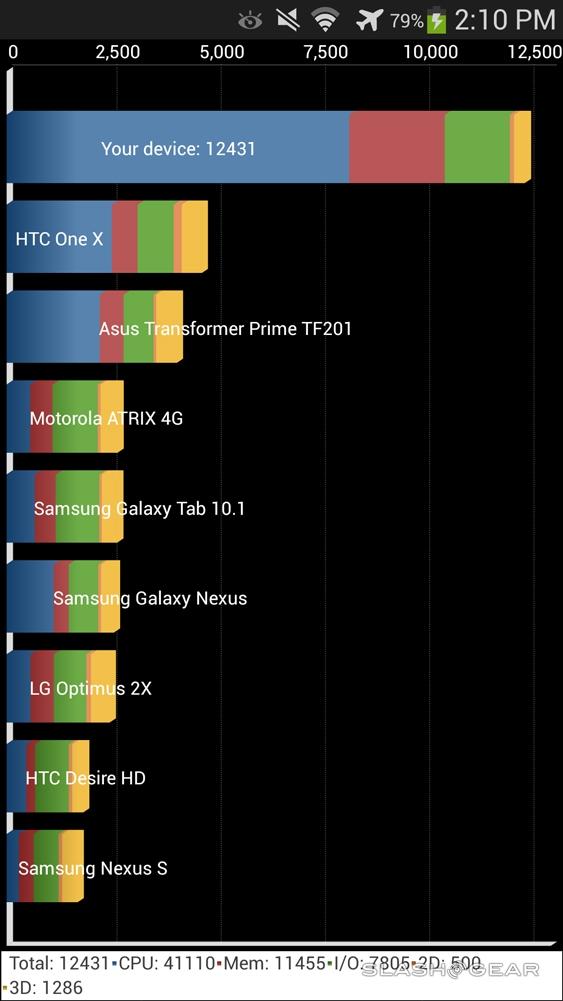 Happily, whether you're running Samsung's apps or third-party software, we've got no complaints as to how fast they run. In Quadrant, the GALAXY S 4 scored 12,593 overall – just slightly ahead of the HTC One – while in Linpack for Android it also bested HTC's phone, managing 749.63 MFLOPS compared to the One's 694.102. In Qualcomm's own Vellamo test, it scored 1,783 in the HTML5 category and 814 in the Metal category: worse, and better, respectively than the One. HTC grabbed the lead in AnTuTu, however, with the GALAXY S 4 scoring 17,320, nearly 7,000 points behind the One.