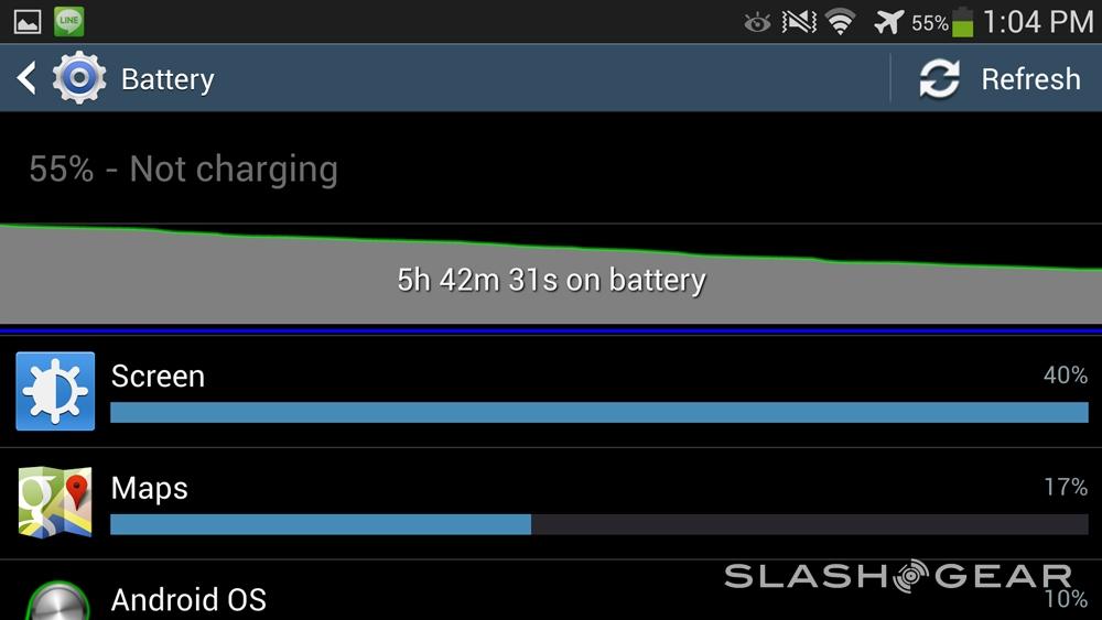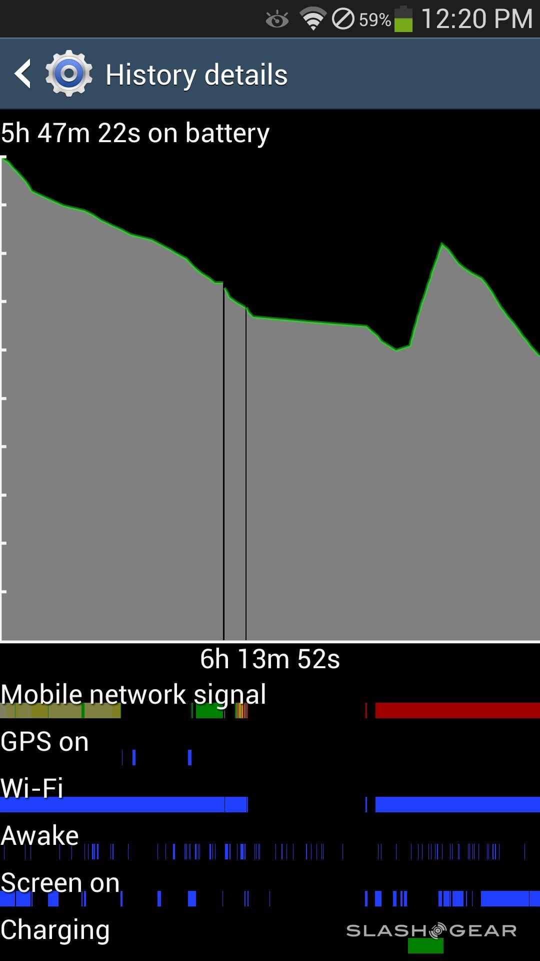 Our lingering impression is that picking up a spare battery may well be a very good idea. Loaded up for typical use – with push email active; some use of maps, multimedia, and the camera; a few calls; and some messaging – the GALAXY S 4 ran for around 13-14 hours before needing a recharge. Longevity was particularly affected by what apps it was running, however. With instant-messenger LINE active, for instance, we saw runtimes drastically cut, even when the phone was in Airplane mode with no cellular data connection active. In contrast, LINE on the HTC One had minimal affect on power consumption.