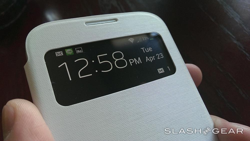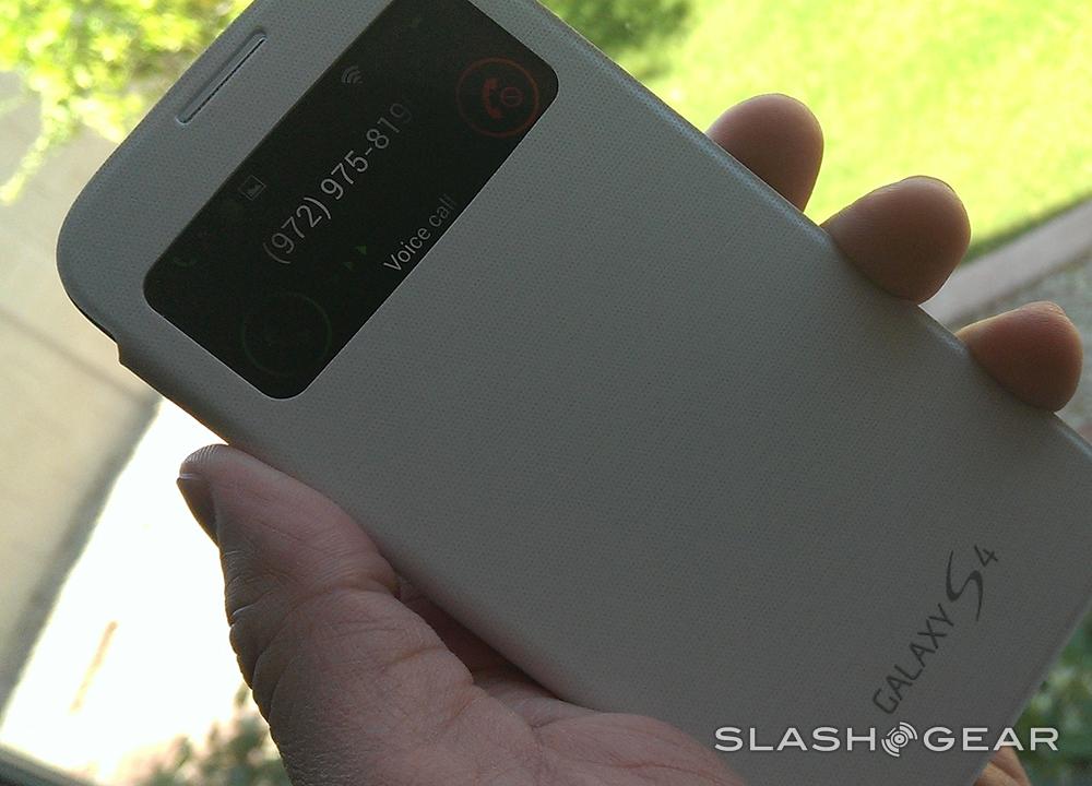The difference, however, is the clear plastic window near the top of the cover, through which you can see a portion of the GALAXY S 4's display. This takes advantage of one of the advantages of AMOLED compared to LCD: namely, that you can selectively power up a part of the display, but not the rest, and so consume less juice overall.
