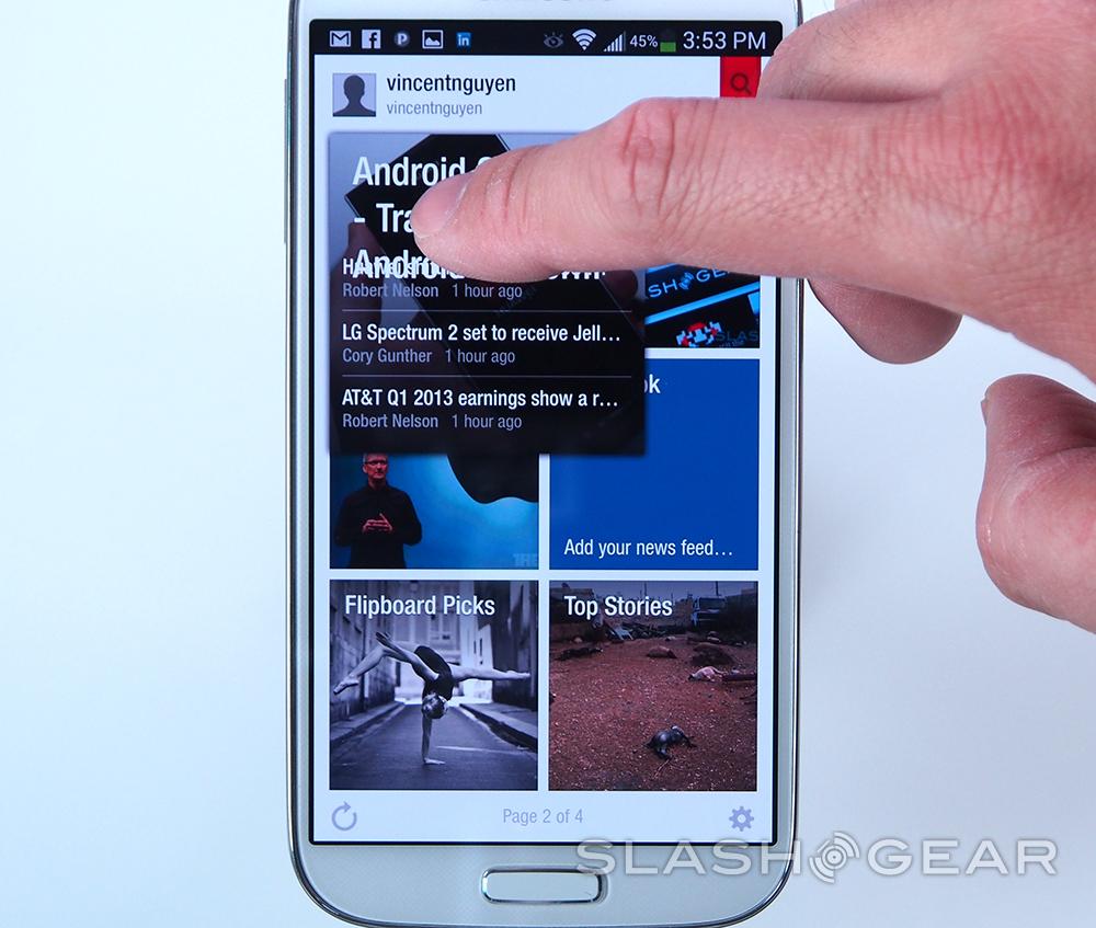The screen itself has become smarter, too, with Air Gesture and Air View introduced. Just as the Galaxy Note II can track the nib of its S Pen stylus when it's hovering over – but not touching – the display, now the GALAXY S 4 can recognize a fingertip close to its screen. Hover your finger over a Flipboard story, say, or a calendar entry, and a preview window will eventually pop up. It works, but it's a little on the sluggish side for our liking: sometimes it proved quicker to actually tap in and then hit the back button, rather than wait for Air View to react. Not all apps support the feature, either: if you want Air View in your inbox, for instance, you have to use Samsung's email app, not the Gmail app we prefer. One plus is that the GALAXY S 4 can be used even when you're wearing gloves.
