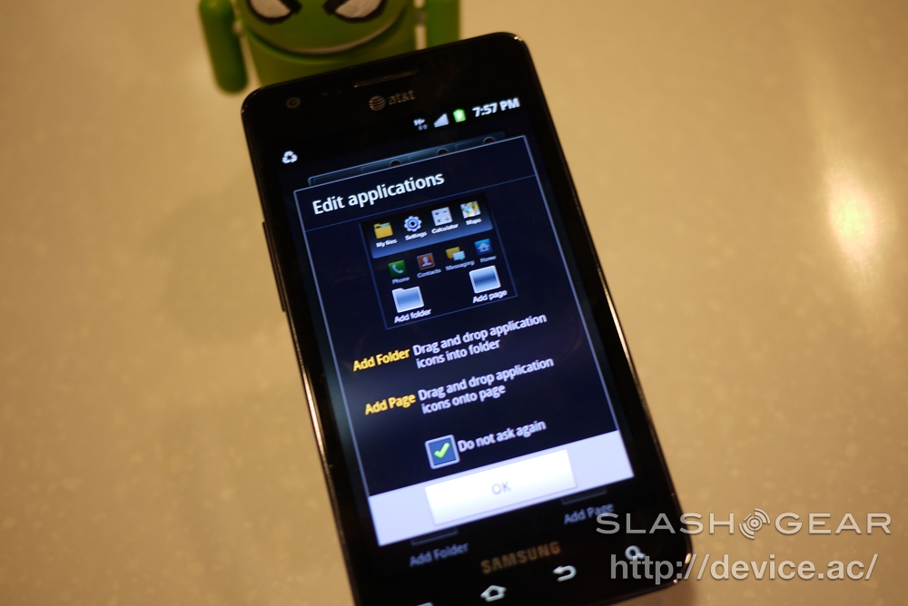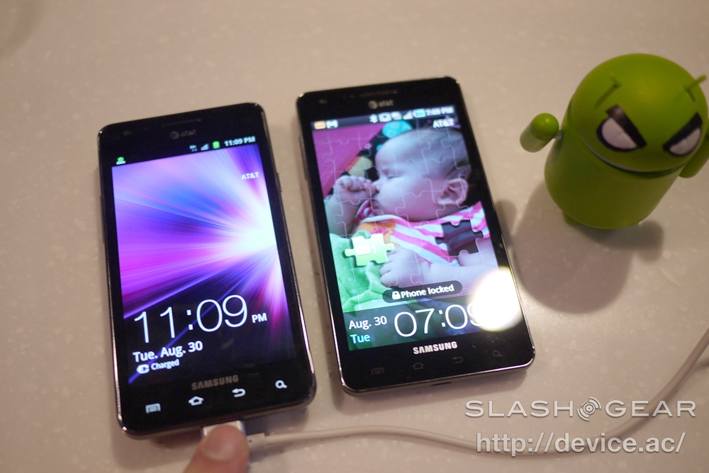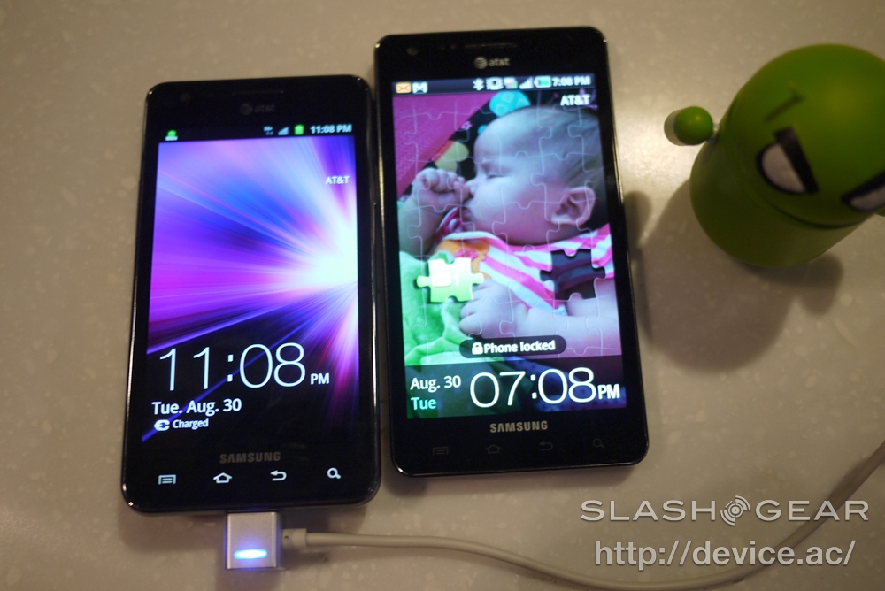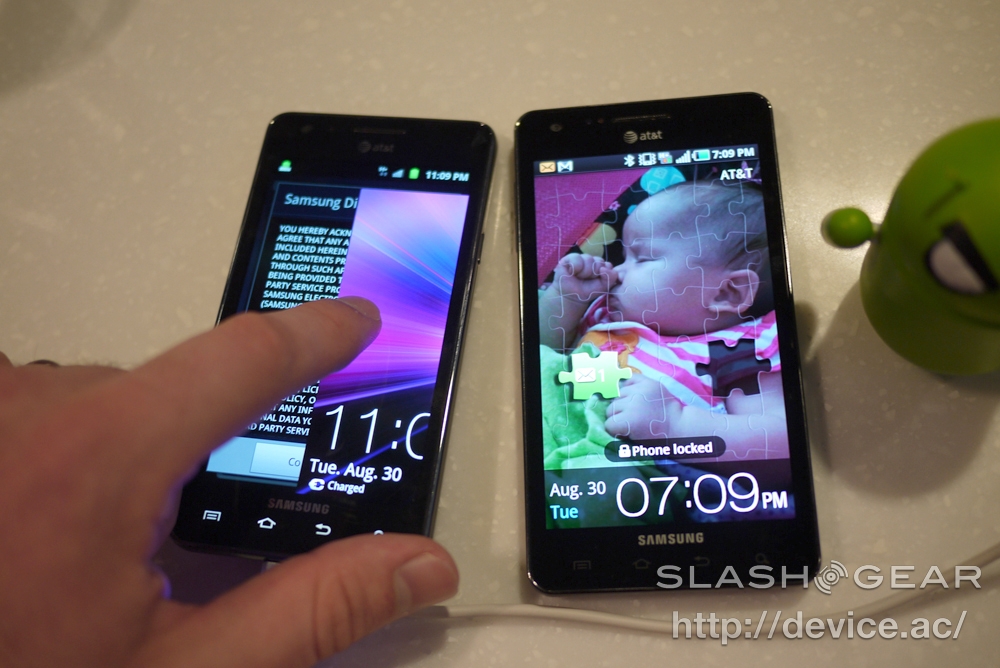 The second of three declared versions of the internationally popular Samsung dual-core Android device, the Galaxy S II from AT&T, is set to be the only one of three to have the original 4.3-inch display. Now why, you might ask, would they do such a thing? I think the answer may be staring you right in the face with its own fantastically cute face: that's my daughter under the puzzle piece lockscreen of the AT&T Infuse 4G, a device not unlike the Galaxy S II that came out quite a few weeks ago with the same 4.5-inch Super AMOLED Plus display you're now seeing on the WiMAX and T-Mobile versions of the Galaxy S II. What AT&T has done here is to give you a choice of devices, both of them with Super AMOLED Plus displays, but one with a larger display and a smaller processor, the other with a smaller display and a larger processor. Choices!