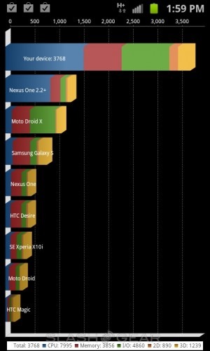 I know benchmarks don't tell the entire story, and many users don't care to read about them and would just like to know about real world usage. I'm happy to report the Galaxy S II is really one of the quickest, most fluid and easy to use phones I've had my hands on to date. I've experienced no delays or lag during browsing, gaming, benchmarks, loading multiple images in the gallery or anything. Even downloading about 10 app updates at a time the experience was barely touched and the overall performance was stellar. From adding icons to different pages, to flipping through homescreens and the application tray there is no gitters or choppy moments that I've experienced yet. This is truly a great performing smartphone that will meet any users demand.