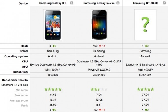 Meanwhile, there's also apparent confirmation that a device previously tipped to be the Galaxy S III, the Samsung GT-i9300, is indeed a midrange device with an unusual screen resolution, rather than the true next-gen flagship. According to benchmarking spotted at PowerBoard, the GT-i9300 runs a 1.4GHz Exynos dual-core and Mali 400MP graphics with a 600 x 1024 screen, just as was reported over at Android Community last week.