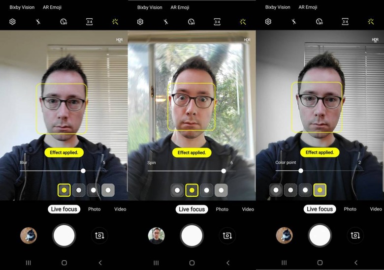 On the front, the S10 and S10e get a 10-megapixel Dual Pixel f/1.9 camera, while the S10+ adds an 8-megapixel RGB depth camera too. Its presence – as well as explaining why the Infinity-O hole is twice as wide – is to improve Live Focus selfies. Sure enough they're fine in most cases, but I still had issues with focus fringing around trickier sections like hair.
