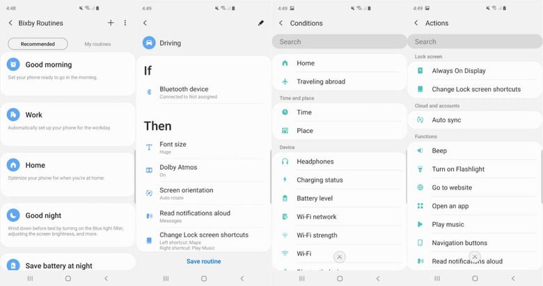 They could be as simple as automatically changing the display and notification settings based on the time you typically go to bed, or turning WiFi off when you leave the house. However, the potential for complex routines is huge. Triggers can be charging status or battery level; when a certain app is opened or if headphones are plugged in or unplugged; or when you arrive at a certain place. Actions include turning on airplane more or mobile hotspot; setting Do Not Disturb or adjusting the volume or screen brightness; playing music; opening specific apps; or even loading a particular website.