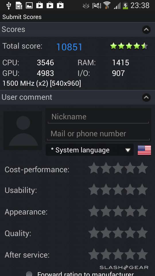 Up front you've got a 1.9 megapixel camera that works surprisingly well – or is at least tuned to look superior even when shooting something so terrifying as the users' face (as shown above).