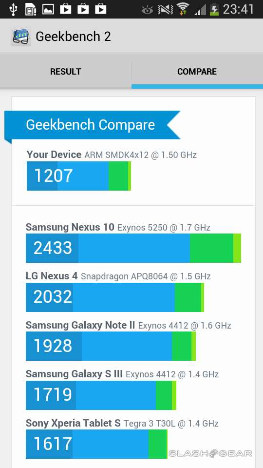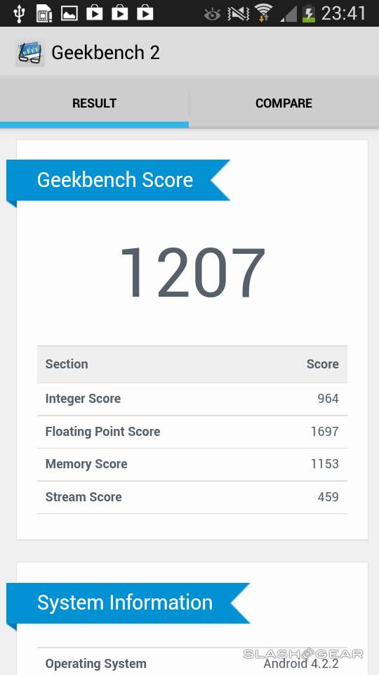 This device's processor is a 1.5GHz dual-core Samsung Exynos 4 (4212) (the same as appears in the Samsung Galaxy Tab 3 8.0) paired with 1.5 GB of RAM that's certainly not meant to bust the charts out with benchmark greatness, tuned instead, it would seem, to the camera UI alone. It'll still be able to be your general smartphone engine as well, but don't expect to be playing the highest-powered games any time soon – not without lag.