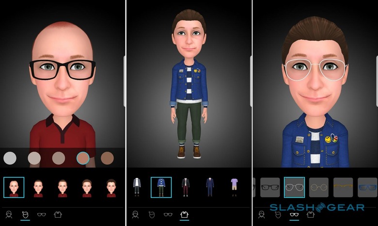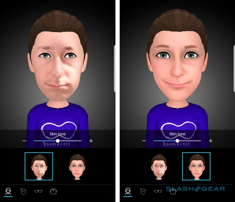 After that, you can customize the character, though I found there was less flexibility there than you might think. Samsung allows you to adjust skin tone, change hairstyle and color, and then add glasses and costumes. If you want to change your eye color, though, you're out of luck; similarly, you can't do some impromptu virtual surgery and slim your face, shorten your nose, or give yourself bigger lips.