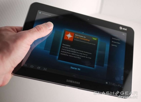 Again take a peek at our review of TouchWiz UX for the Galaxy Tab 10.1 to see what this device is running more in-depth, otherwise feel free to see the hands-on video we've got here to check the size difference. This version of TouchWiz is running a bit more smooth than it was on the 10.1 when it was first launched, and it's certainly nice to have the screenshot feature at the bottom of the screen, but that bar sitting around at all times can get rather annoying. Where Android's tablet-specific operating system version Honeycomb and the soon to be prevalent tablet and handset-based Ice Cream Sandwich both have the feature where these buttons fade down to nearly invisible when you don't need them, Samsung has found it necessary to remind you that they're there at all times with a dedicated bar. This takes away a bit of your screen space for taps as well as for viewing space, mind you, so you may well want to consider this when looking for that perfect tablet.