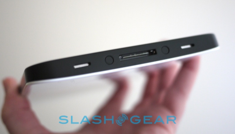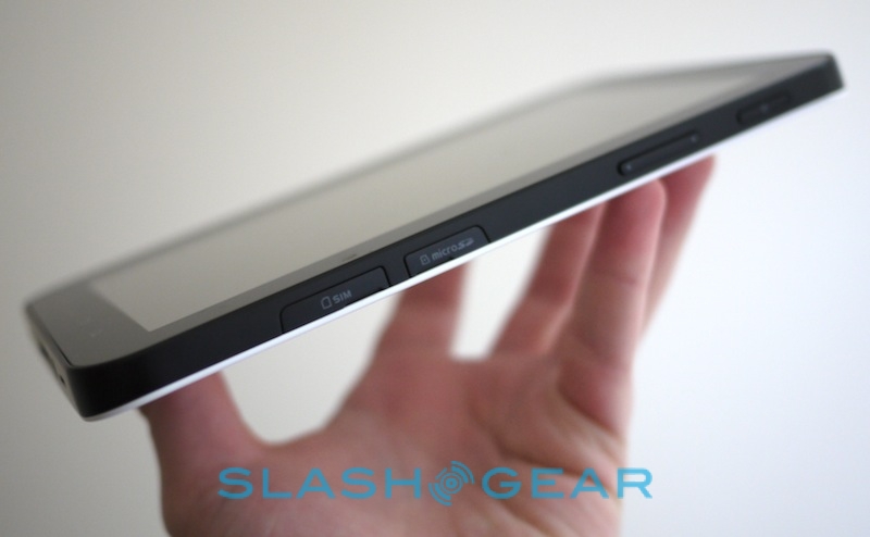 Hardware controls are limited to the right-hand edge, with a power/standby button and a volume rocker near the top. Below them there are two easily-opened doors, for the microSD card and – on the GSM models – for the SIM card. The former is hot-swappable, but the latter triggered a reboot when we attempted to swap the SIM with the Tab switched on. On the top edge there's a 3.5mm headset socket, while a small microphone is on the left-hand side. On the bottom is the proprietary dock/sync port, flanked by stereo speakers.