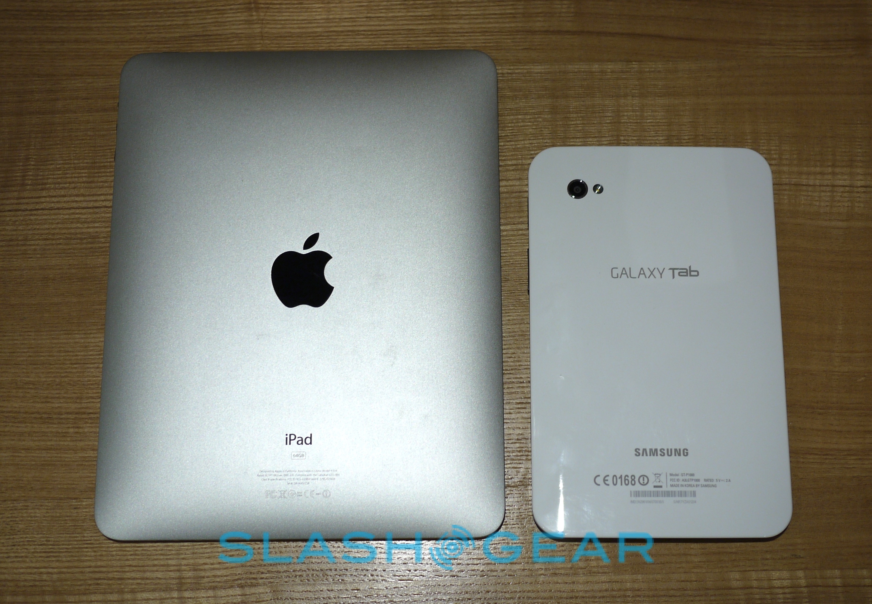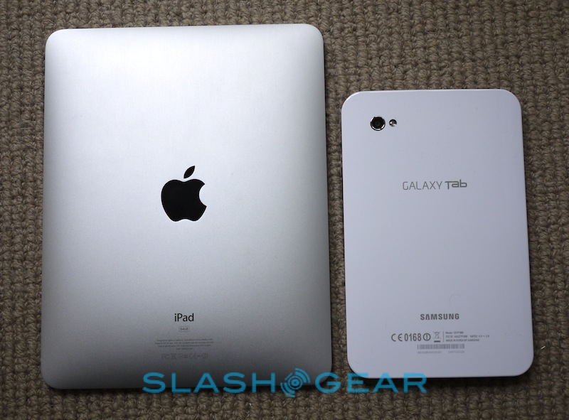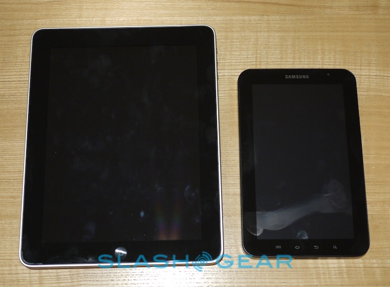 In terms of size, the paperback-scale Galaxy Tab will fit into the front pocket of our (non-hipster-tight) jeans with the top corner still visible. It's also narrow enough to fit into the inside pocket of an average jacket. Handbags or small messenger bags will have no trouble accommodating it whatsoever. The non-voice-enabled North American versions fall somewhere in-between phone and tablet, however, seeing as most people will still want to carry a cellphone of some sort. Nonetheless, the Samsung is definitely more portable than the iPad.